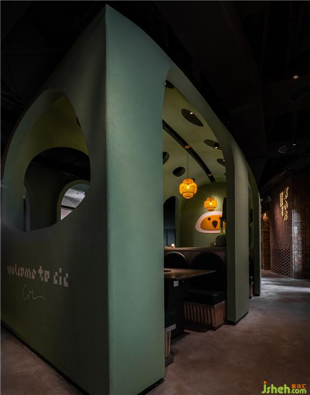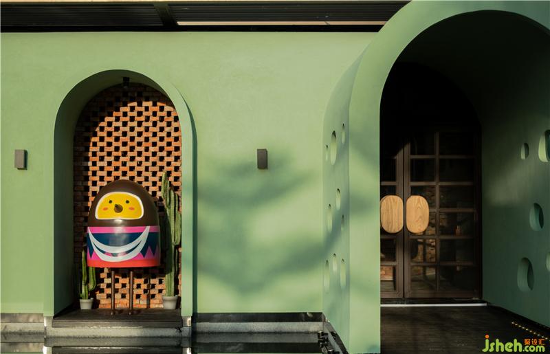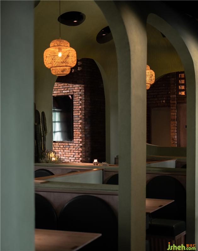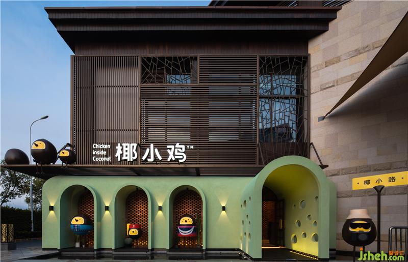 風格,為本身就具有少數(shù)民族文化特色的地方帶來了新建筑形式。作為一種延續(xù),在本土文化與創(chuàng)新之間要取得商業(yè)平衡,適應當下消費文化,餐廳設計上就需要擯棄陳年老調(diào),改革換新。紅磚綠瓦、木柳相契,紅磚墻與拱形門兩種鮮明的東西方建筑元素傳承本土性,而不拘泥平俗的灰綠色色彩代表海南獨有的椰林碧海,這些象征著歷史人文和工匠精神的元素,通過設計的重新演繹,支撐了椰小雞品牌背景與唯一性。