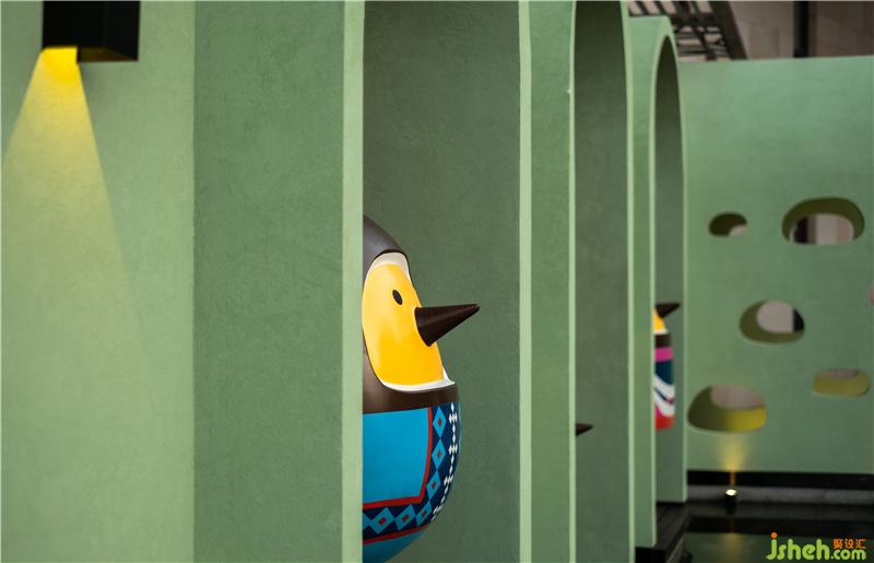 外立面陣列排布的一個一個拱形門洞,與椰小雞家族雕塑裝置形成有趣的櫥窗組合;延伸出來的拱形隧道洞口是餐廳的主入口;條形橢圓形窗口使外部的自然光被輕巧的引入,灑進地面和桌面上;空間內(nèi)的拱形房中房在開合收放中不斷切換,使空間形成不同的功能分區(qū),也形成不同的用餐體驗,既滿足了運營需求,也滿足了顧客用餐私密性的社交需求。