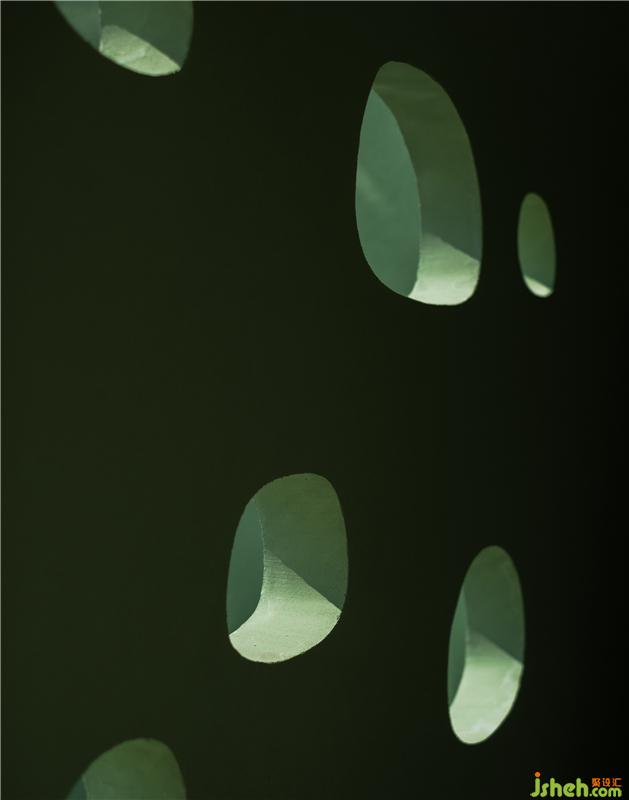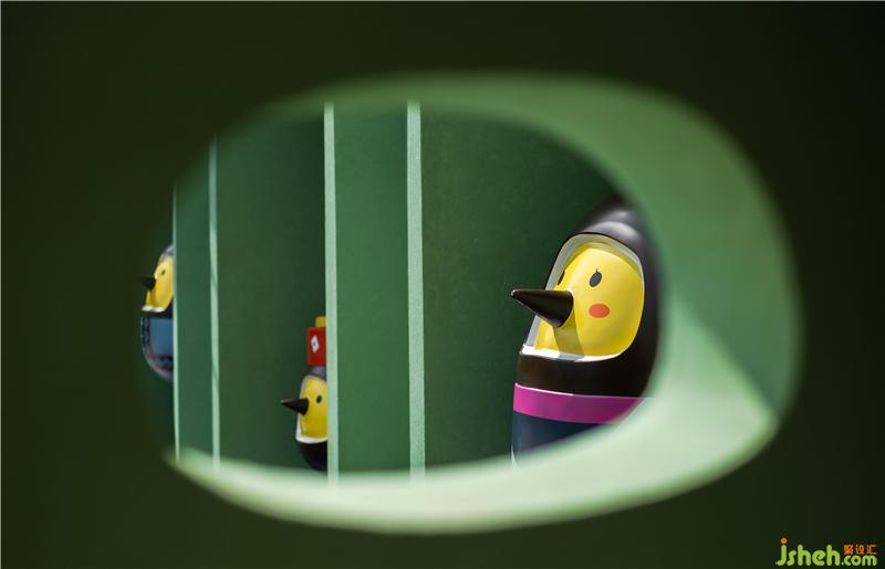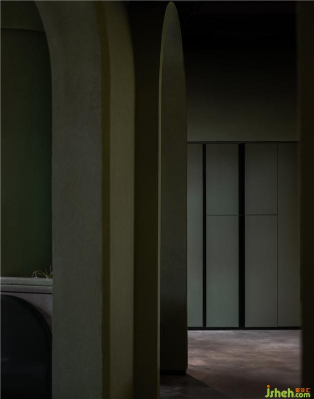 椰小雞臉型的洞口巧妙的融入在拱形界面上。這種不規(guī)則的形態(tài)似乎自然生長在空間中,成為空間中一個個透氣和對景的窗口,在看向某一個小洞口時就會發(fā)現(xiàn)設計師特意創(chuàng)造的小驚喜。