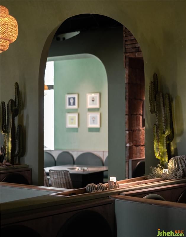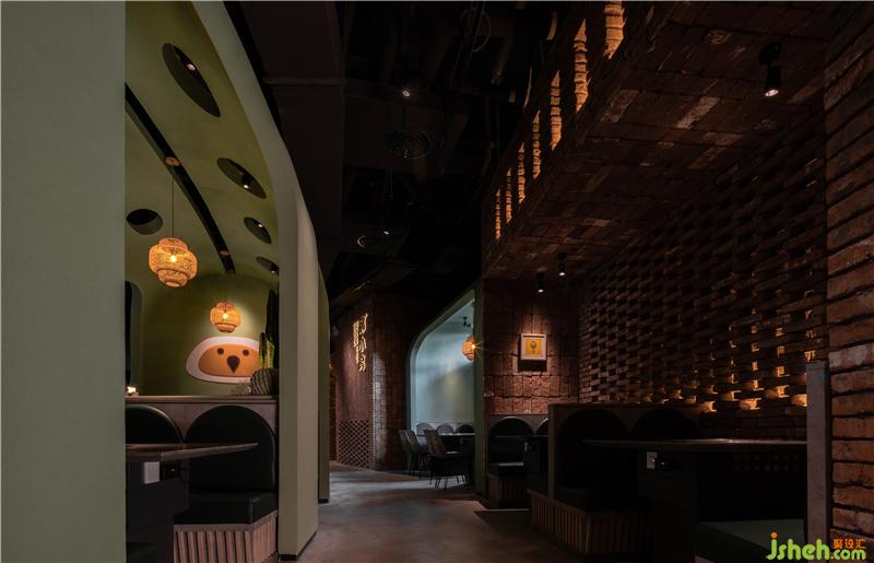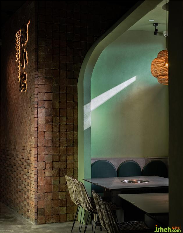 在灰綠色水泥的對(duì)立面,紅磚作為空間另一種主材,形成了有趣的色彩互補(bǔ)和質(zhì)感碰撞,設(shè)計(jì)師將這兩種美學(xué)元素并置在一起,前者體現(xiàn)優(yōu)雅格調(diào),后者則流露出文化沉淀后的底蘊(yùn),而兼顧生活感和藝術(shù)感,也是提升消費(fèi)者品味和凸顯品牌格調(diào)的一種方式。紅磚墻堆砌與拼接的設(shè)計(jì),不只是一道隔斷,傳統(tǒng)的工藝會(huì)賦予它力量感,光線也會(huì)隨著時(shí)間透出神秘的感覺,在實(shí)虛交互之中,人們會(huì)從間隙中滲出詩(shī)意,粗狂但很浪漫。