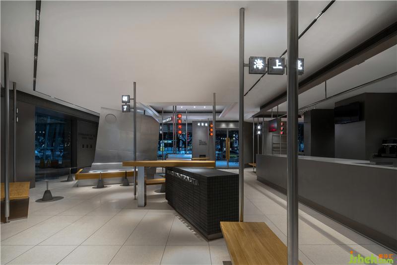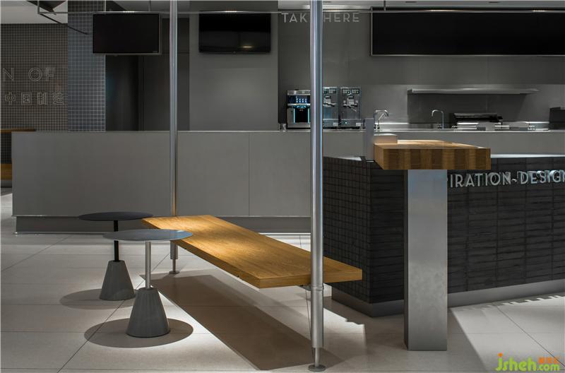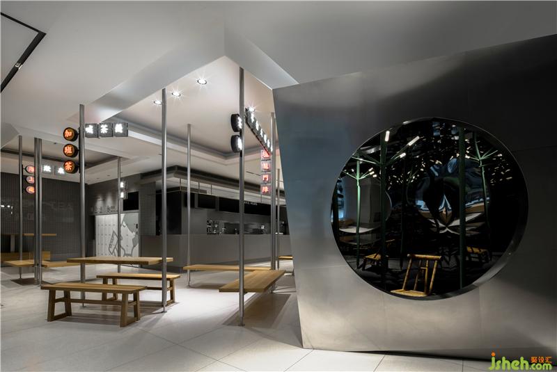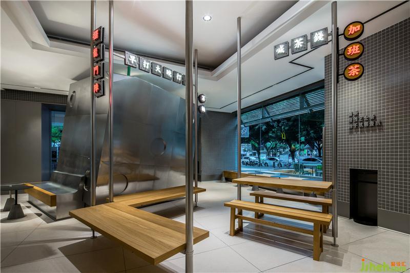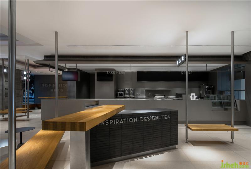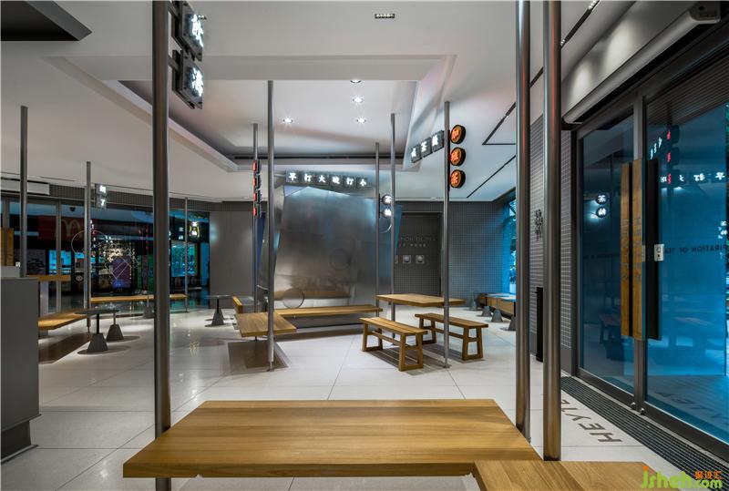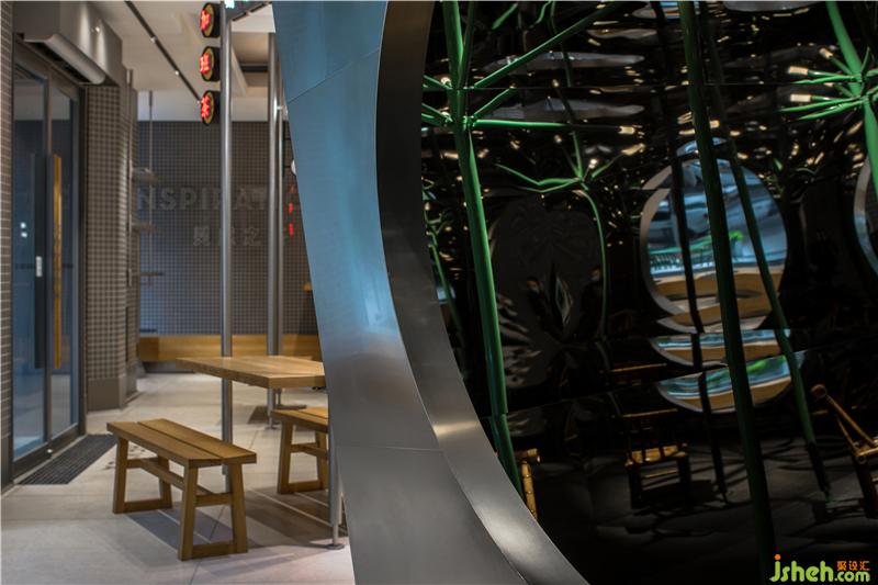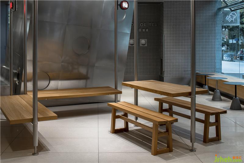 喜茶裝修設(shè)計采用不銹鋼立柱固定原生竹木條凳,人群自由的穿梭其中,如在竹林般放松愜意。