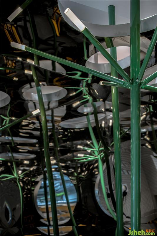 在戶外窗對景的空間中心投擲了一顆骰子。視線穿過一大扇落地窗撇見它的一眼,拉回你所有目光,透過月亮門你與喜茶的故事就此開始。骰子內(nèi)部是鏡面不銹鋼空間,地面鋪上回收灰磚,中心生長青竹藝術(shù)燈,通過鏡面的反復(fù),搭建出陶醉感和夢幻感的小天地。徜徉在成都市井生活的氛圍里,沉醉于玲瓏雅致的朦朧風(fēng)韻中,一把竹靠椅獨坐幽林處,燈光從枝桿縫隙中灑下,讓人們浮躁煩亂的內(nèi)心,感覺絲絲清涼的氣息與安閑愜意的感覺。