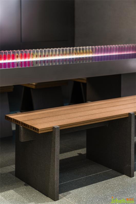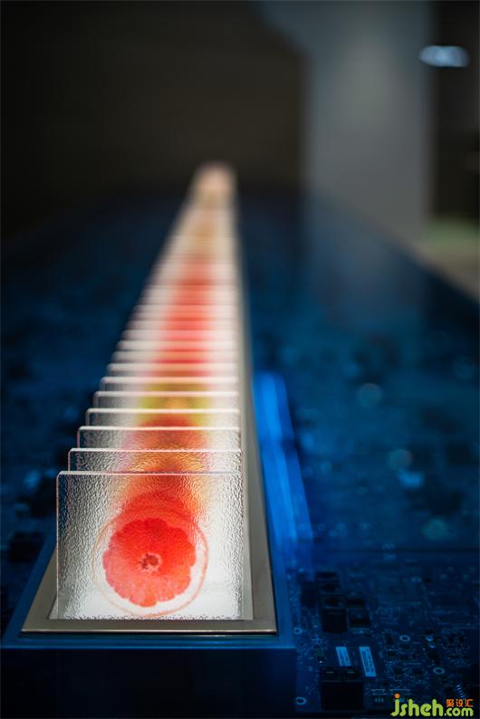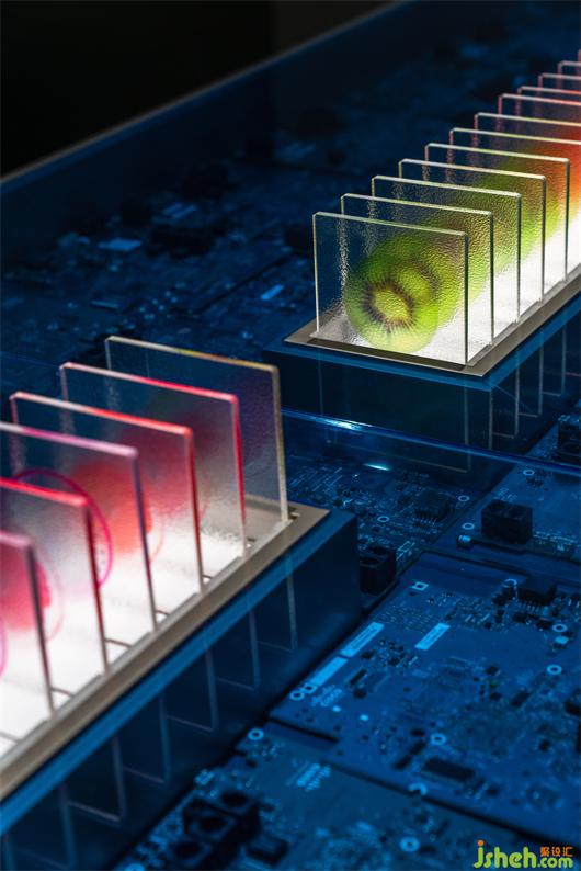 原始冷咧的工業(yè)氣質(zhì),精密整齊的電路板和屏幕上跳動(dòng)的代碼互相呼應(yīng),鮮活的水果切片在透明亞克力里如琥珀般將瞬間化為永恒,不同水果經(jīng)形狀與色彩排列組合,形成延伸與序列感。水果實(shí)驗(yàn)室將“維生素搬運(yùn)工”的概念可視化,由此探索微觀分子世界,探索時(shí)間的現(xiàn)在與未來(lái)。