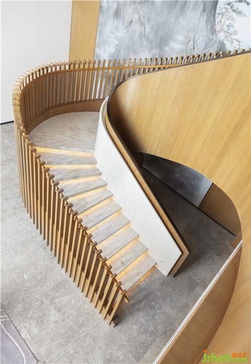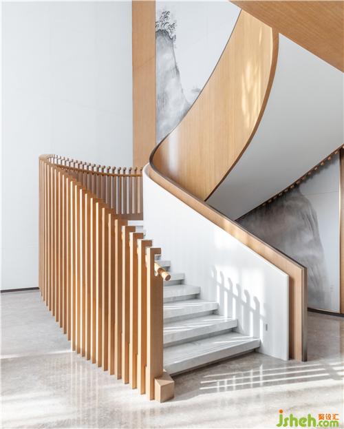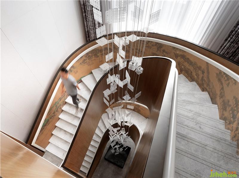 客廳家具選用盧志榮經(jīng)典系列,高級米咖色系加上藍(lán)綠色藝術(shù)品點(diǎn)綴空間,讓空間簡潔之余富有美學(xué)張力,旋轉(zhuǎn)樓梯利用石材和木飾面的碰撞用獨(dú)特的手法與工藝相結(jié)合加上起伏的琉璃鶴尾造型藝術(shù)裝置燈,展現(xiàn)出空間靈動(dòng)性和韻律感。背景巨幅山水墨畫彰顯東方韻味的藝術(shù)氣息,點(diǎn)亮整個(gè)空間,又不過分跳躍。