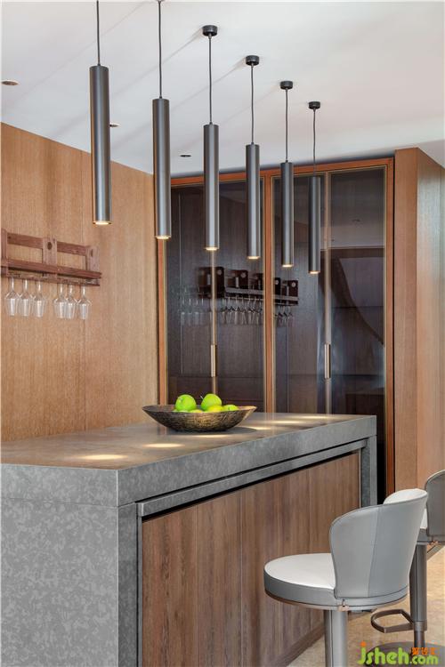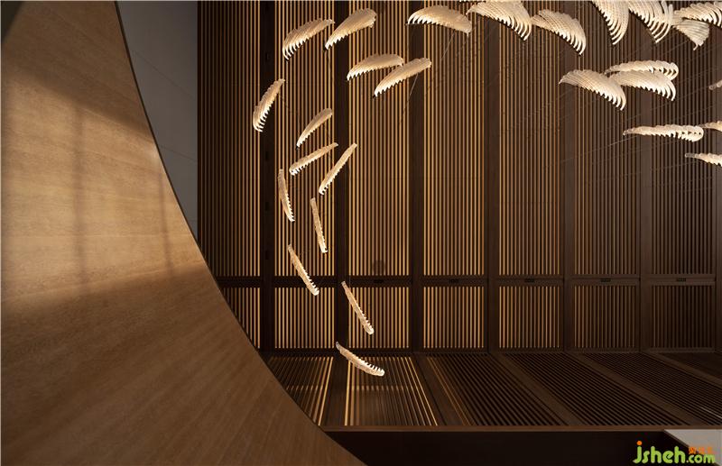 會客廳空間采用留白的手法, 靈感源自北宋范寬《溪山行旅圖》,主體大畫部分為巍峨高聳的山體,高山仰止,壯氣奪人,寓意寄情山水的寫意生活;挑高的空間帶來震撼的視覺感受,會客廳空間的頂部由細(xì)密的木條覆蓋了整個(gè)天花,體現(xiàn)出傳統(tǒng)的東方建筑風(fēng)格。暖灰調(diào)的石材、深啡色的木作和古銅材質(zhì)形成豐富的色彩和質(zhì)感。頂部垂落的琉璃鶴尾,仿若夏花般絢爛,讓氣氛變得熱烈,氣息變得歡快愉悅。別墅裝飾