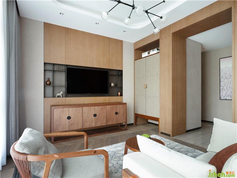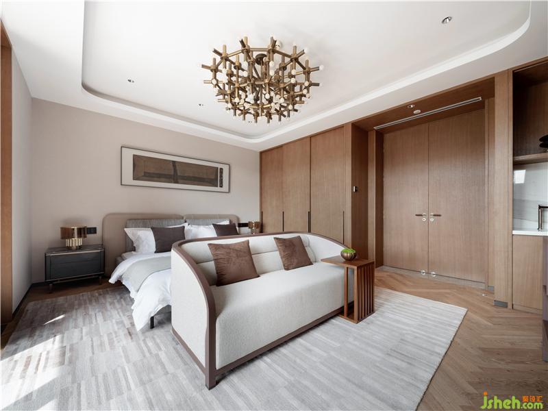 大面積采用了煙熏啞光鐵刀木飾面和素色硬包,簡約大氣以及中式的留白。使主人在以后的生活閱歷中增添自己喜好的收藏和經(jīng)歷、別有一番情趣。主人房盡顯沉穩(wěn)大氣之勢,整體木色淺灰的色調(diào),當中以藍色為點綴,彰顯干練的同時,又不失寧靜的氛圍,讓主人在繁忙的工作中能夠享受生活。
