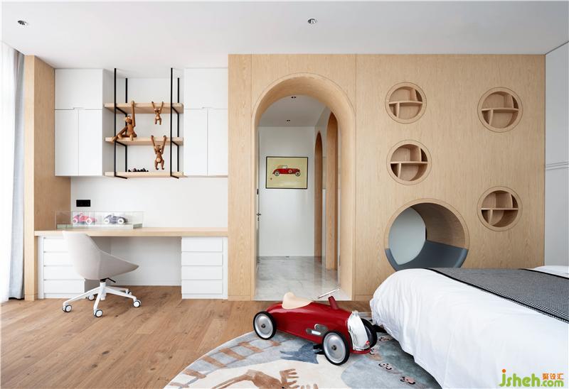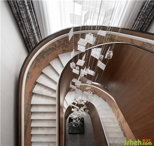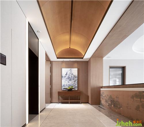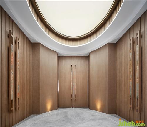 三層走廊盡頭圓形的聚廳,寓意四平八穩(wěn)八方來(lái)財(cái)?shù)脑O(shè)計(jì)理念同時(shí)在主人轉(zhuǎn)折與停留的一剎那能夠感受到自然帶來(lái)的強(qiáng)大能量作為加持。榫卯結(jié)構(gòu)的原創(chuàng)門拉手內(nèi)嵌麒麟玉石材,寓意為金玉滿堂,麒麟為吉祥之意,體現(xiàn)了主人的品味與地位。走廊拱形的頂面增強(qiáng)空間的莊嚴(yán)感。別墅裝飾