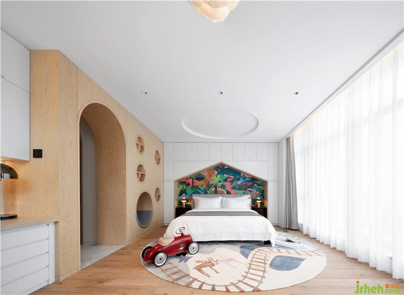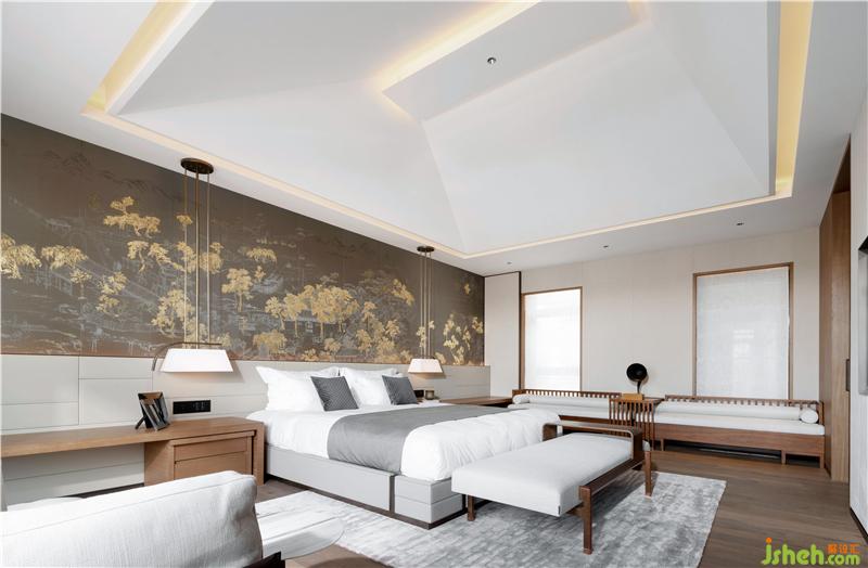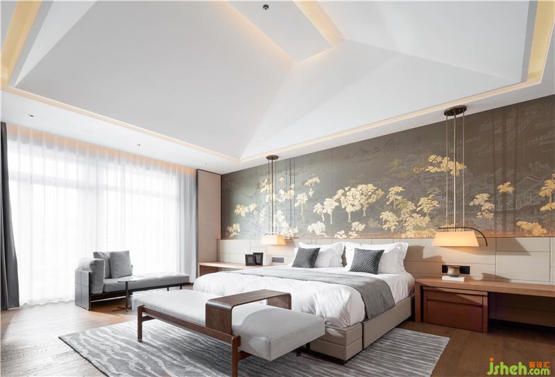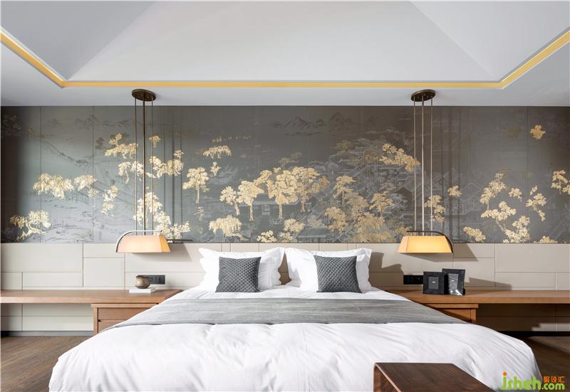 主臥室以開(kāi)放自由的方式處理,采用半透明的材料分隔,形成格而不透影影綽綽的自然風(fēng)。床頭巨幅背景機(jī)噴手工畫是整個(gè)空間的亮點(diǎn),是清明上河圖的延續(xù),是畫龍點(diǎn)睛錦上添花之落筆。