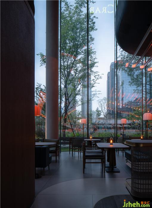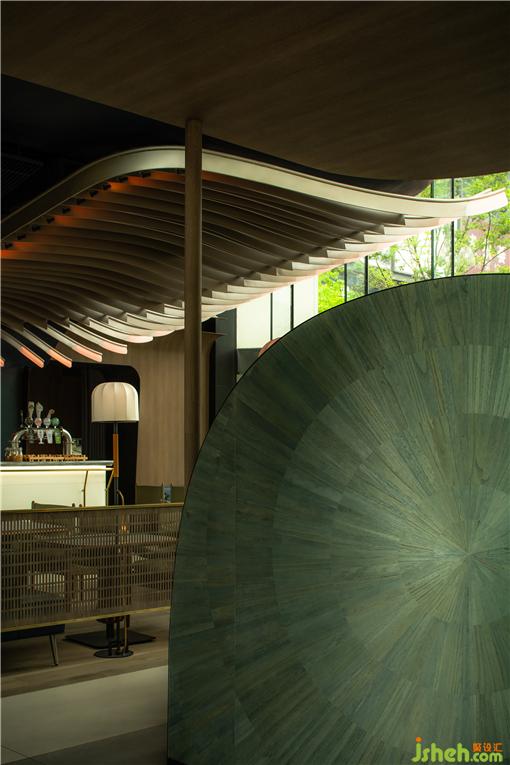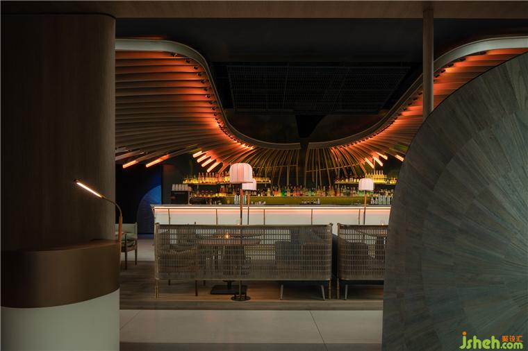 二層為MOC的正餐部分,由于二層的采光和視野極佳,雙塔盡收眼底,我們希望整個(gè)二層將不再需要任何的元素去影響視野,而重點(diǎn)餐廳設(shè)計(jì)出如貝殼狀的天頂,結(jié)合單獨(dú)設(shè)計(jì)的照明裝置,渲染整個(gè)頂部輪廓,讓整個(gè)空間在建筑外部呈現(xiàn)通透和精細(xì)的質(zhì)感。讓BOX·MOC在整條交子大道上格外的亮眼。