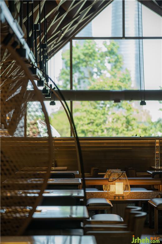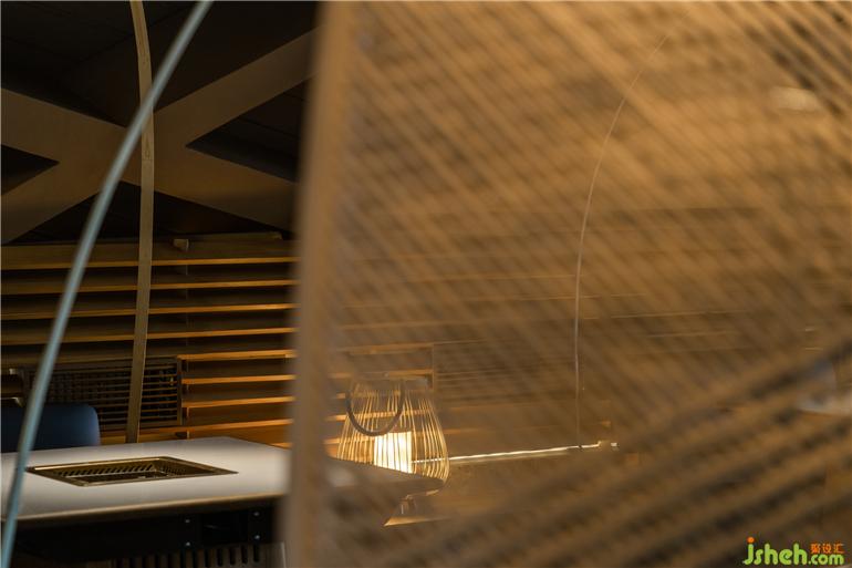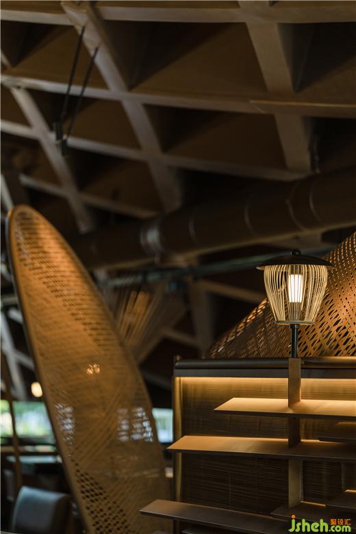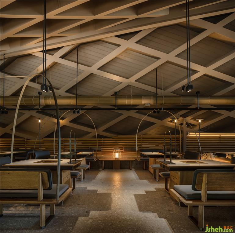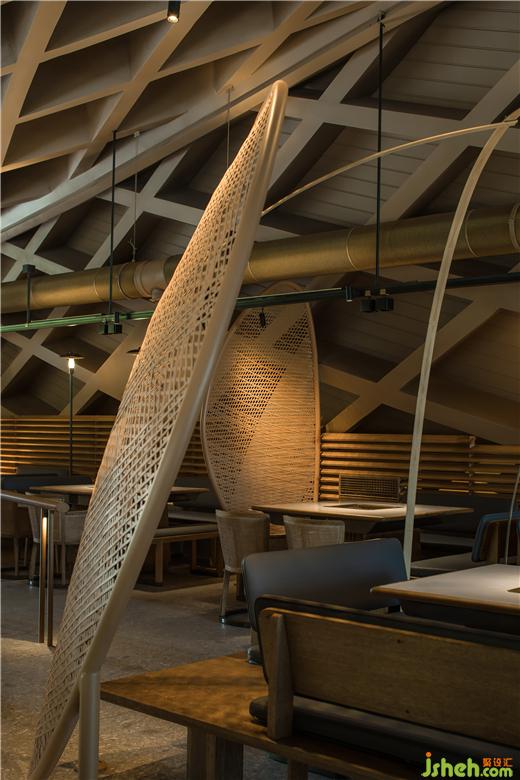 原有建筑中,火鍋店設計留下了曲線勾勒的柔軟斜頂,也因此有了塑造田園、人家的設計構想。竹編的勞作工具是川西人們最親密的助手,我們將之重新定義,組合成風雨蓬,隔間屏風等多樣的主題構件,也由此展開了所有空間印象的設計延伸。