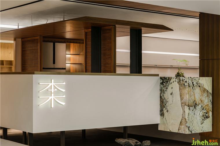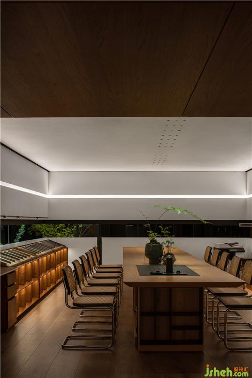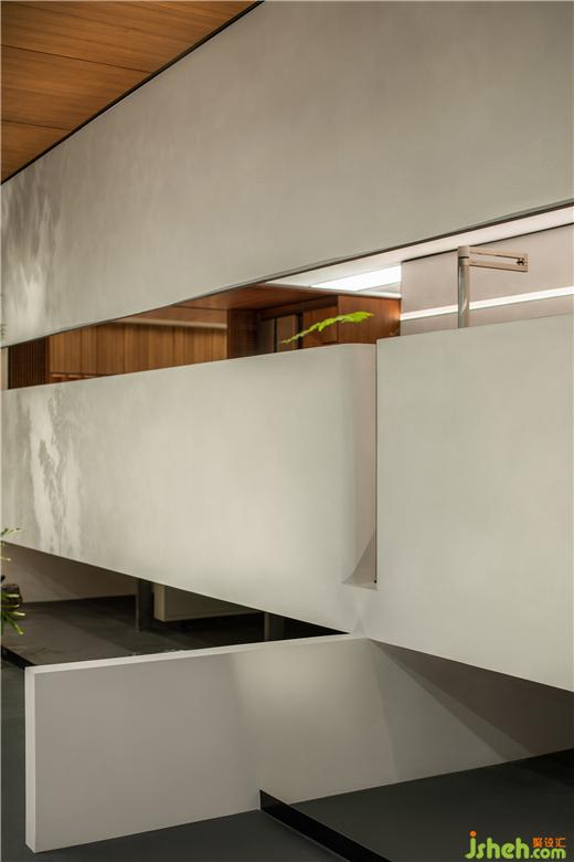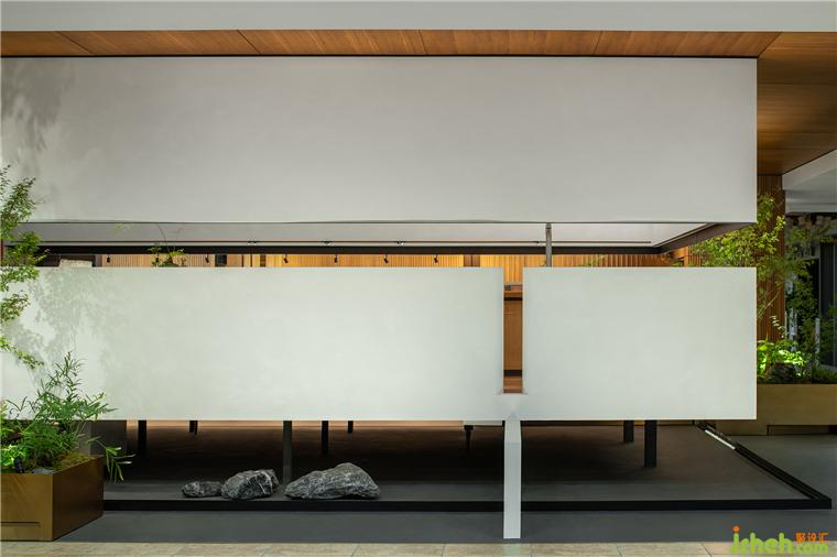 在這里,展廳設(shè)計(jì)師恰如其分地引入室內(nèi)園林的元素,點(diǎn)綴的頑石在架空層邊緣,與植物枝影成為界定空間邊緣的元素,生氣怡然。橫貫盒子中上部的長窗的高度被設(shè)計(jì)師精心設(shè)計(jì),成為視線遮蔽與開啟的重點(diǎn)。這樣,接待與方案討論被共享和自然分區(qū),互為可交流的風(fēng)景。