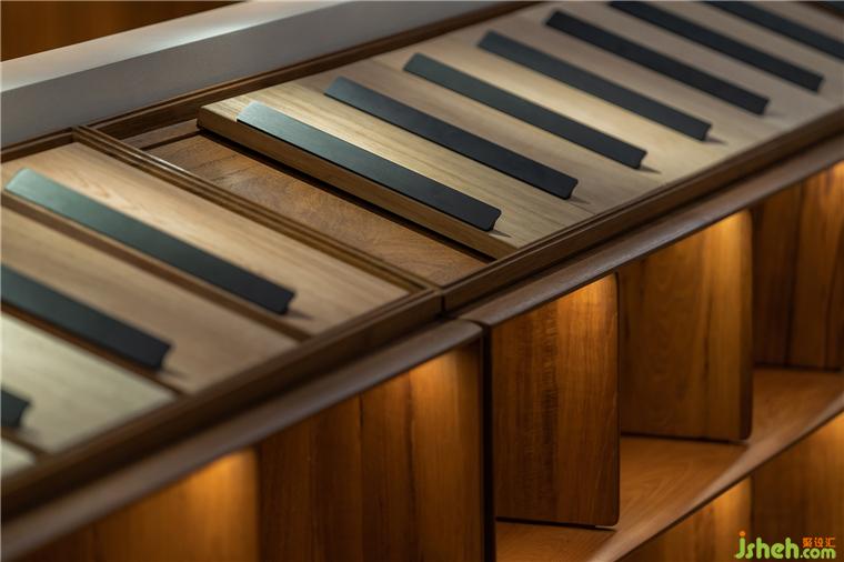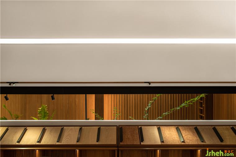 最引人矚目的是在區(qū)域劃分上,設(shè)計(jì)師讓不同屬性的空間交匯在頂部,而不是常規(guī)的地面抬升。展廳設(shè)計(jì)師在這里讓燈光的區(qū)域突變,線條靈動(dòng)而簡約而優(yōu)雅,工藝細(xì)膩。