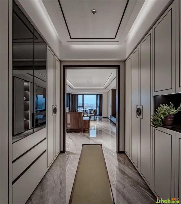 衣帽間與客廳相隔的整面墻體以門洞設(shè)計,淡雅設(shè)色、典雅布局、與金屬把手的古銅色,呈現(xiàn)出清亮的質(zhì)感魅力,復(fù)古感的擺形構(gòu)出一個極具格調(diào)的精神寧謐地帶?;ㄋ囀强臻g的妙筆,恰到好處地呈現(xiàn)了一個極具現(xiàn)代東方美感的世界。