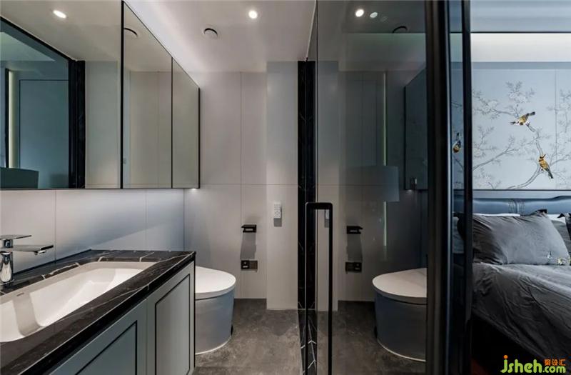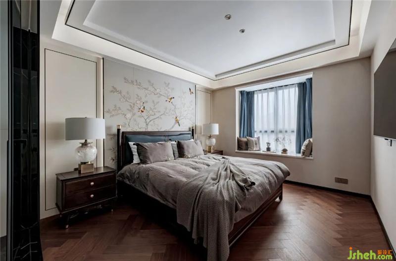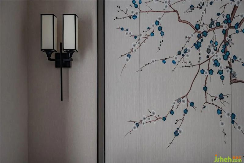 龍巖私宅設(shè)計主臥延續(xù)客廳的素雅靜謐,卻一改水墨意境,樹枝上的嬉鬧的燕雀,帶回春天的洋洋暖意與靈動的氛圍,也寓意著“比翼雙飛”的美好祝愿。