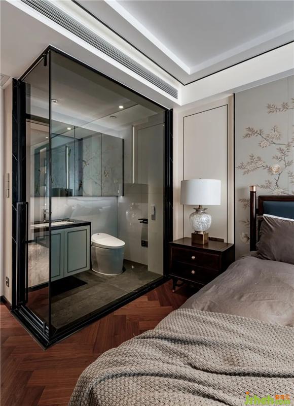 步入次臥,龍巖私宅設(shè)計床頭背景墻上,一幅梅花營造靜中之境,剔除瑣碎的裝飾,與特殊定制的床頭與邊柜形成呼應(yīng),簡潔的形式、柔和的線條,清寂的裝飾,不同材質(zhì)與肌理的碰撞,讓人不覺漫游在傳統(tǒng)與現(xiàn)代交織的藝術(shù)世界。