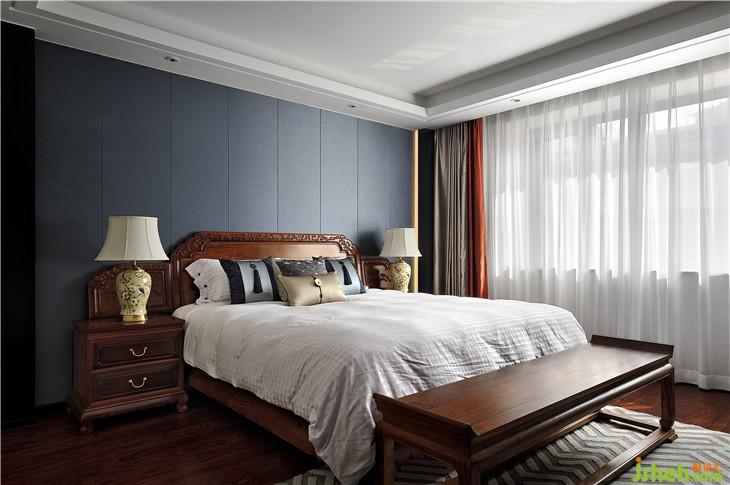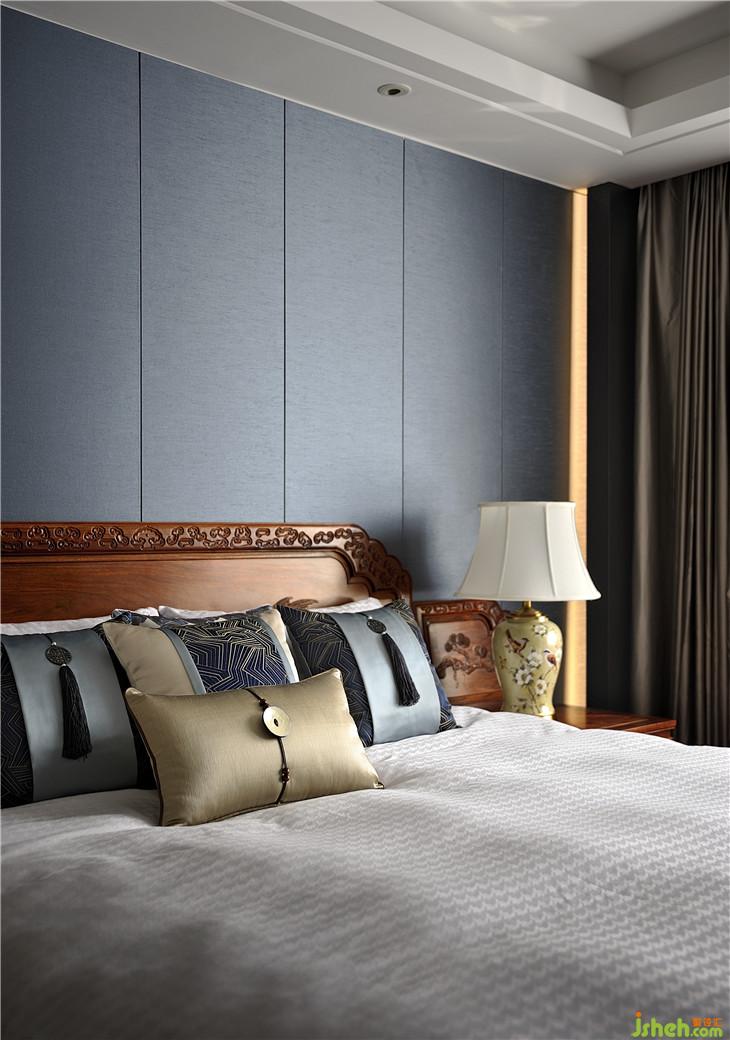 主要材料:灰色大理石、實(shí)木地板、胡桃木飾面、墻布、布藝