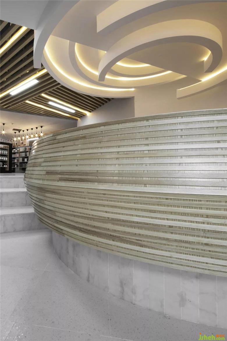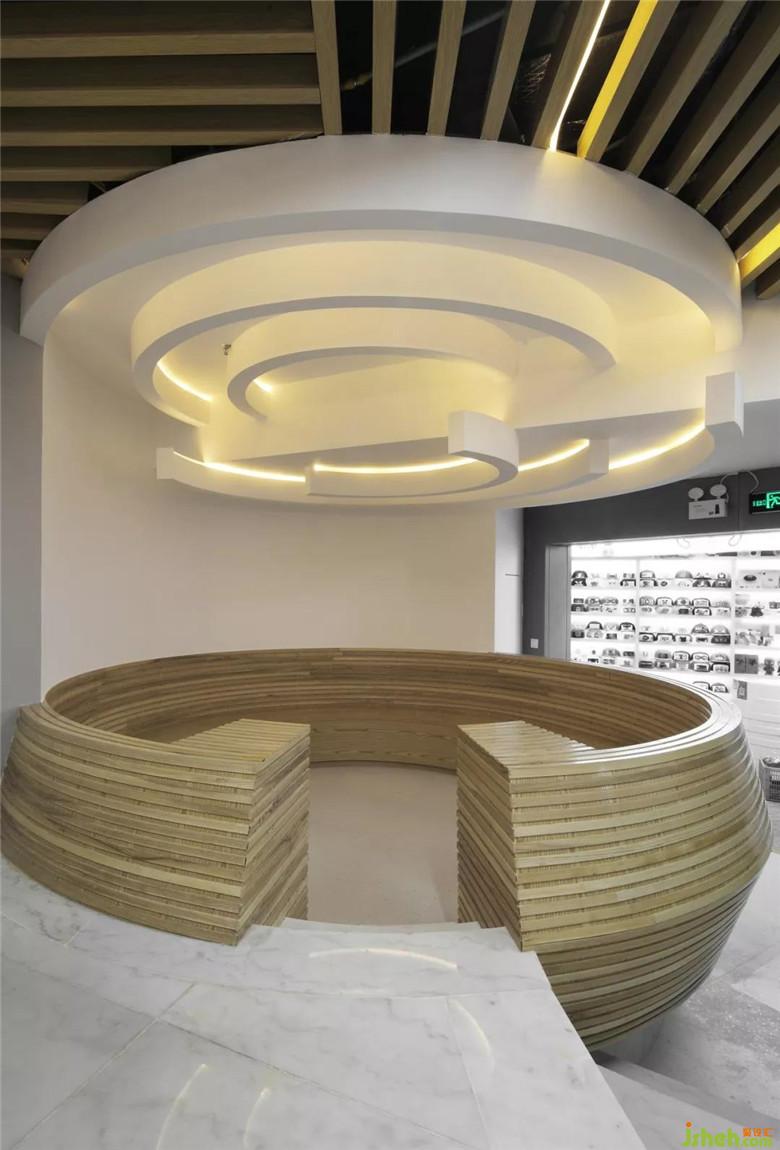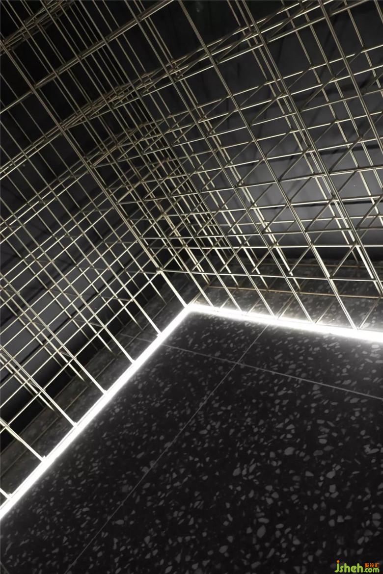 右邊的接待區(qū)是一個(gè)圓形下沉式木制空間,旨在營(yíng)造自然、舒適的交流場(chǎng)所。左邊是一個(gè)縱橫交錯(cuò)的金屬網(wǎng)格矩陣,藉由這種密集的形態(tài),給人帶來(lái)探索未知世界的可能。并通過(guò)三個(gè)不同的出入口,連通了中心展示區(qū)和兒童產(chǎn)品區(qū)。