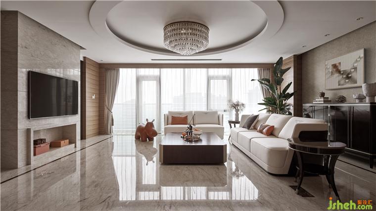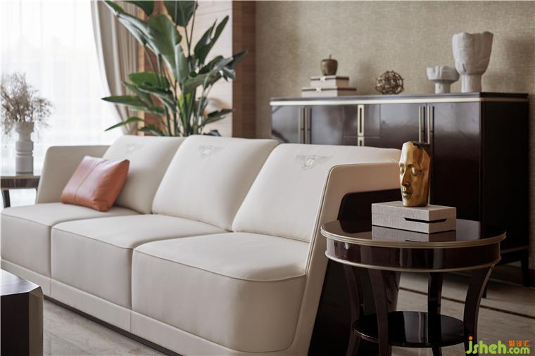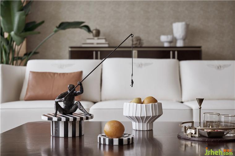 客廳背景以極具質感的紋理大理石為主,配合優(yōu)雅的墻面色系,白色沙發(fā)皮質細膩柔軟,又恰到好處的平衡空間色彩,剛柔并濟,加上不經(jīng)意擺放的各類擺件,悄然流露出居住者的藝術品位。
