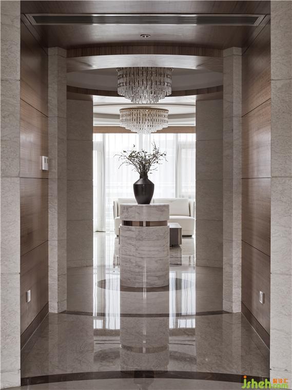 入口呈現(xiàn)出一種純粹奢華的形象。大理石圓柱和過道設計和諧對稱,古典優(yōu)雅,迎接著主人的歸來。