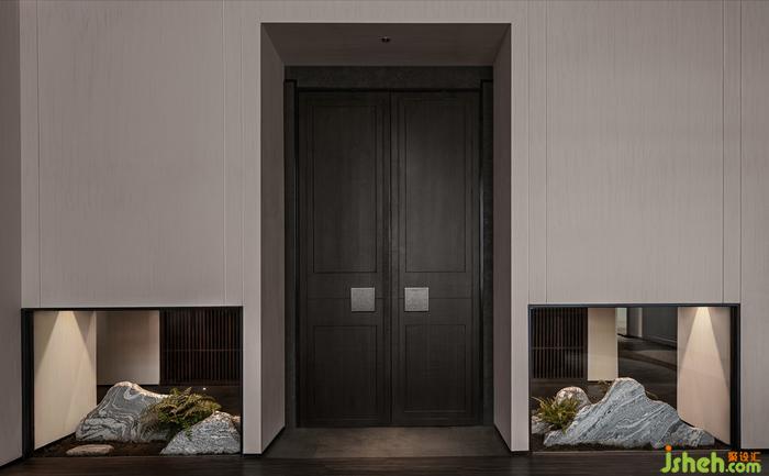 玄關(guān)過(guò)道特意應(yīng)用了曲直的線與面結(jié)合設(shè)計(jì)表現(xiàn)形式,將石材粗糙面與光面的對(duì)比與燈光結(jié)合,讓這個(gè)立體空間成為裝置性的藝術(shù)張力,在體驗(yàn)中感受月亮般的逸美光影。