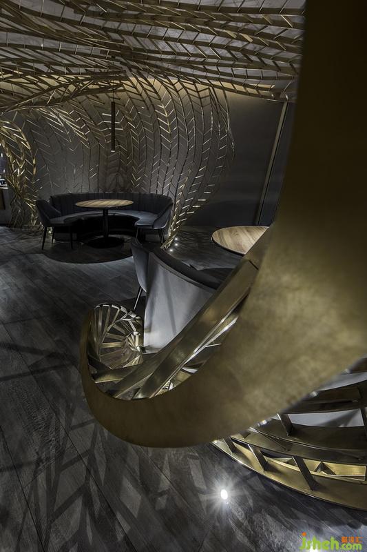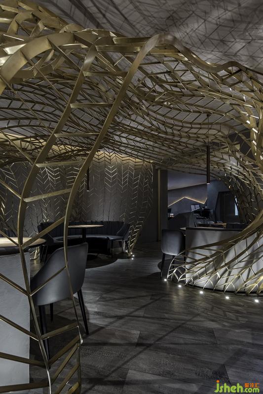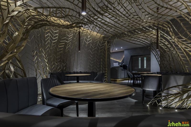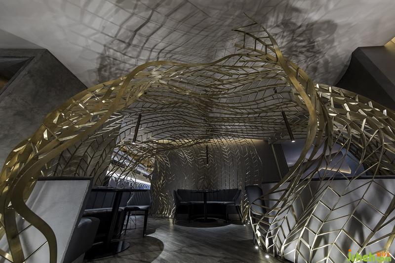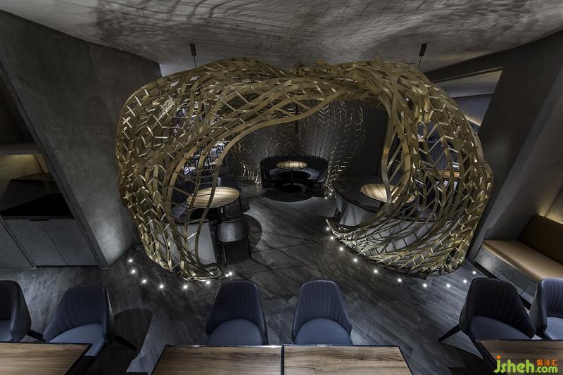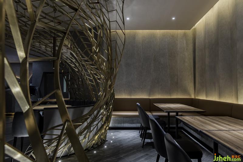該設(shè)計(jì)符號(hào)經(jīng)過(guò)設(shè)計(jì)師的應(yīng)用,在空間里充分體現(xiàn)自然之美。從餐廳的主入口進(jìn)來(lái),首先經(jīng)過(guò)開(kāi)放式就餐區(qū),座位配置以木制的餐桌為主,入口水吧區(qū)的飄帶線條裝置則帶動(dòng)視線移動(dòng)、穿透,該裝置使用不銹鋼的硬朗材質(zhì)糅合舒展的線條,隱約描繪出一幅云動(dòng)水卷的自然景象。隨著這優(yōu)美的線條移動(dòng),則進(jìn)入到網(wǎng)狀不銹鋼獨(dú)立就餐區(qū)。
