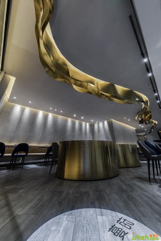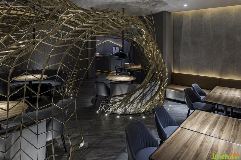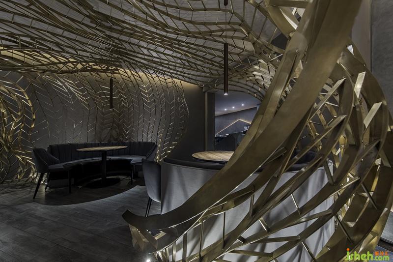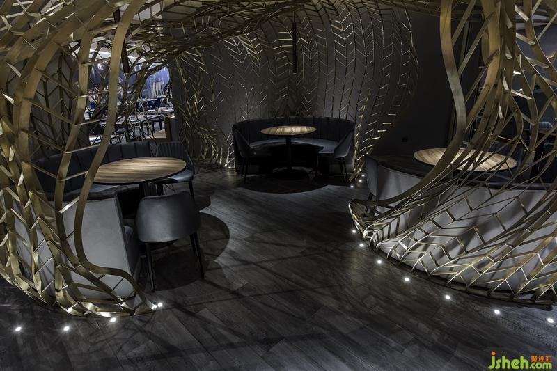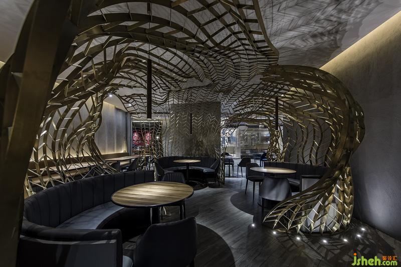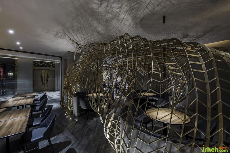銹鋼之間縱橫交錯(cuò),仿若自地?zé)o限生長(zhǎng)的樹(shù)枝,透露出蓬勃的生命力。燈光透過(guò)網(wǎng)狀裝置縫隙,投下了相互交錯(cuò)的光影,光影搖曳之間,宛如樹(shù)影斑駁,風(fēng)吹云動(dòng)。