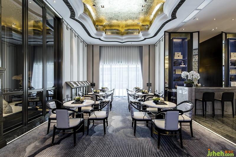 背景墻兩邊設(shè)計(jì)環(huán)繞型屏風(fēng),屏風(fēng)用料規(guī)整,以檀木為框架,呈現(xiàn)出古色古香之美。圍合的屏風(fēng)不僅有迎賓之意,更有分割空間的功能,且與背景墻山水畫作相互輝映,將大堂點(diǎn)綴得奢華雅致。