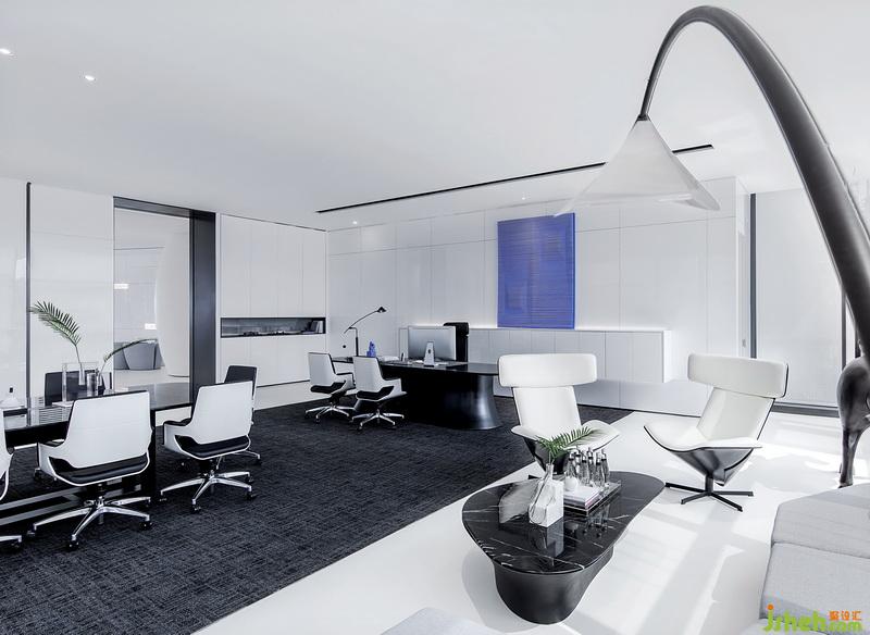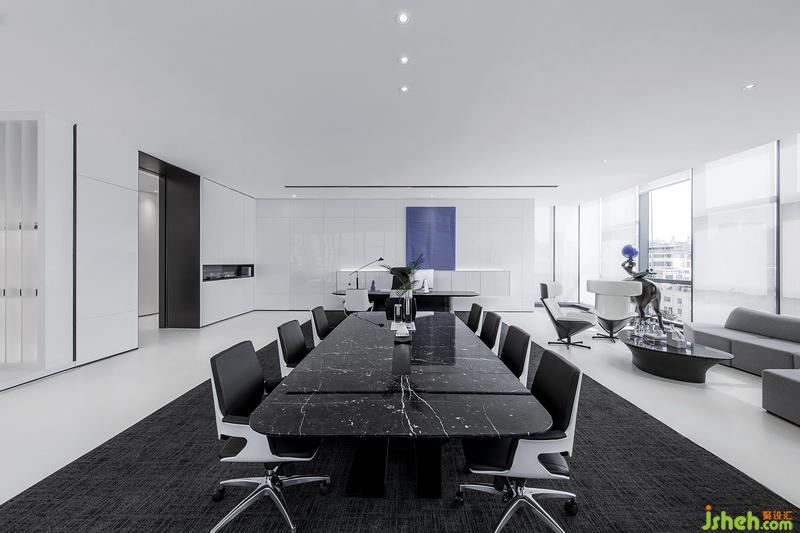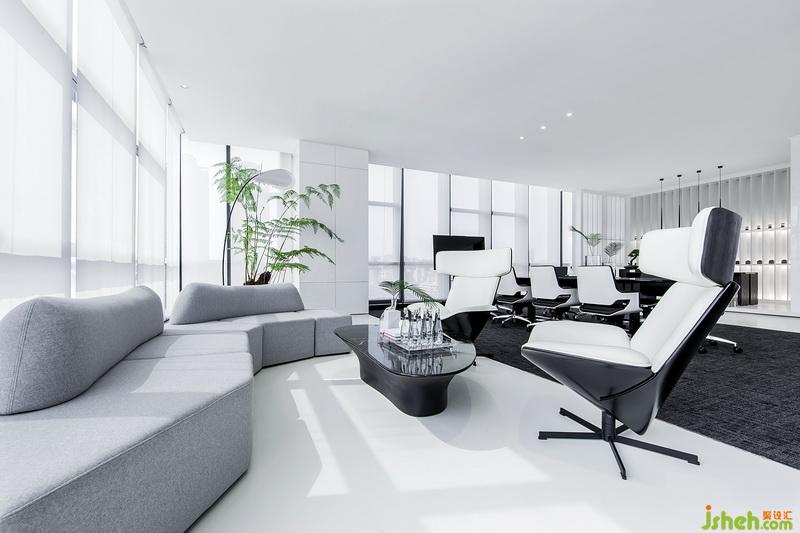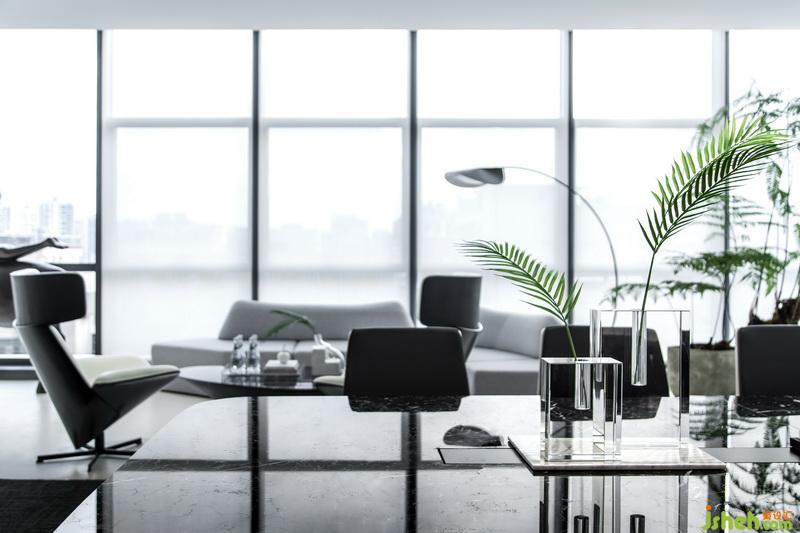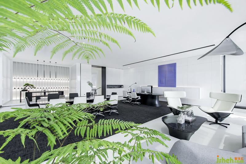 全案大面積鋪以高純度白色,同時以黑色作為輔色,于空間中進行調(diào)和,顯現(xiàn)公司的現(xiàn)代感與科技感。設(shè)計師同時在室內(nèi)多處放置綠植,柔和空間科技感,增加人文自然氣息。一抹抹綠意是一轉(zhuǎn)眼的驚喜,也是工作上的舒緩。所采用的落地玻璃窗將外景引進,深圳的日與夜變成室內(nèi)一幕,俯覽這座城,將城市之景盡收眼底。