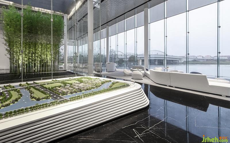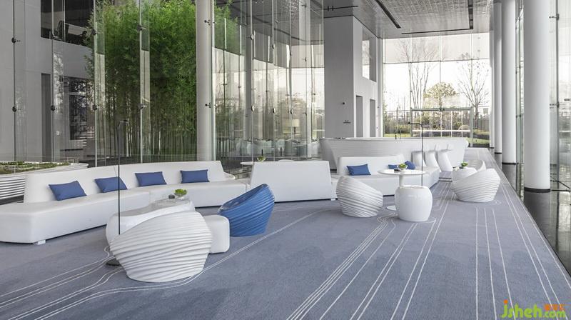各個(gè)空間相互串通,人于空間內(nèi)游走,頗有移步異景之趣。洽談區(qū)呈條帶狀,地毯紋路如盈盈流水,不規(guī)則座椅作溪石,地毯曲線宛如“水”遇“溪石”所呈的蜿蜒曲折之狀,于空間中增添趣味。