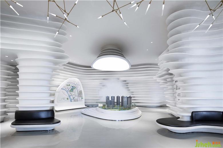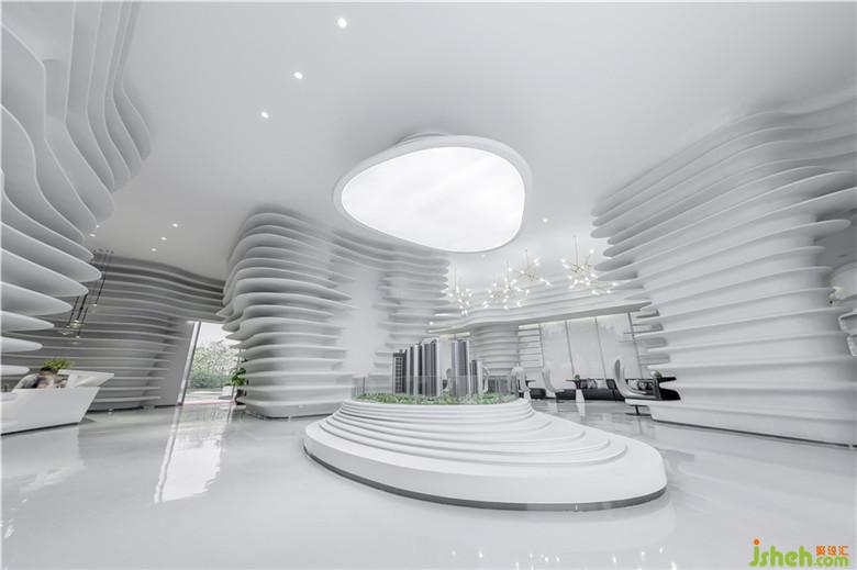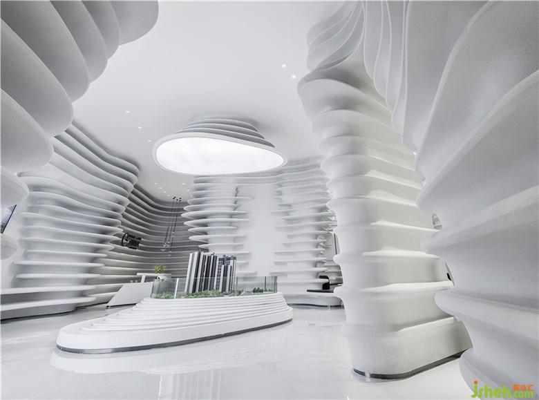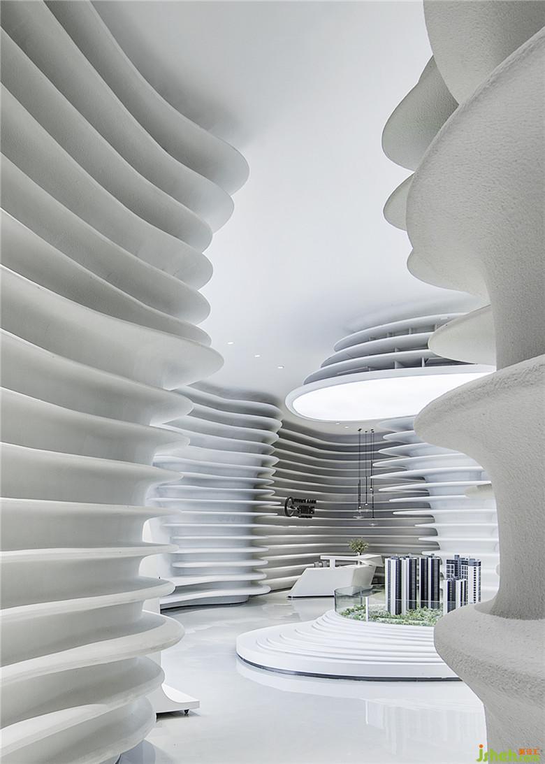 涓涓流水,遇溪石則分,流動線條蜿蜒曲折,化為本案的參觀動線。交疊的曲面體塊形成空間形狀不一的藝術(shù)塊體,將各個(gè)區(qū)域巧妙地進(jìn)行劃分,同時(shí)讓入室動線趣味生動。