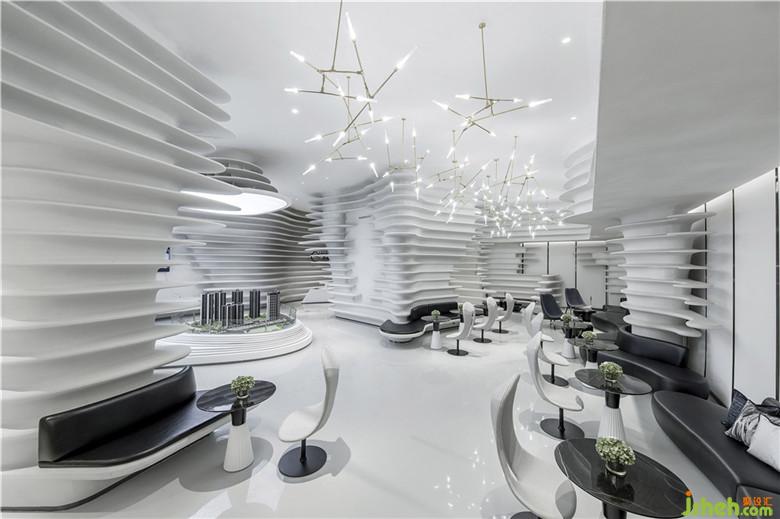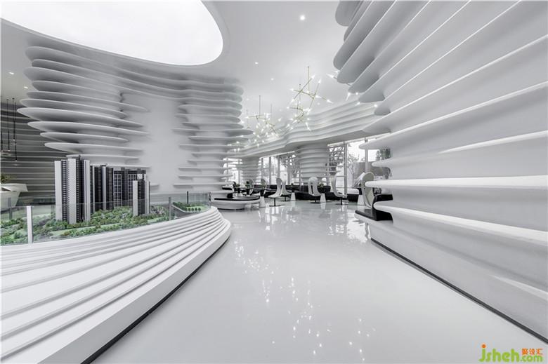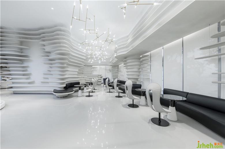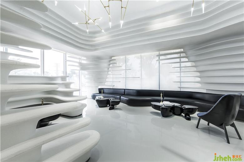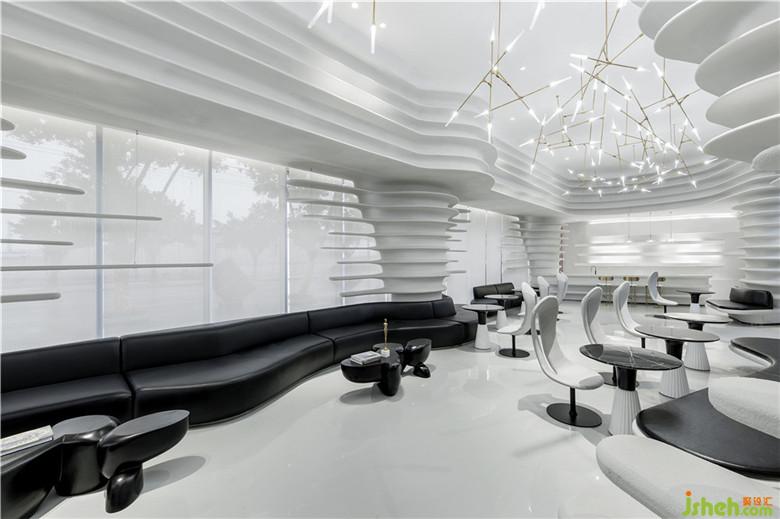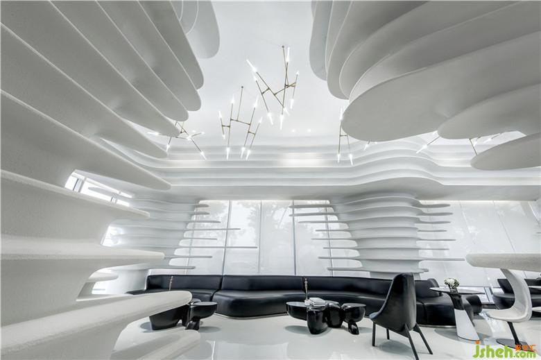 曲面層層交疊,形成錯落有致的塊體,其線條如水之形,造型如山體之狀,成波瀾壯闊之勢,蔓延于室內(nèi)。