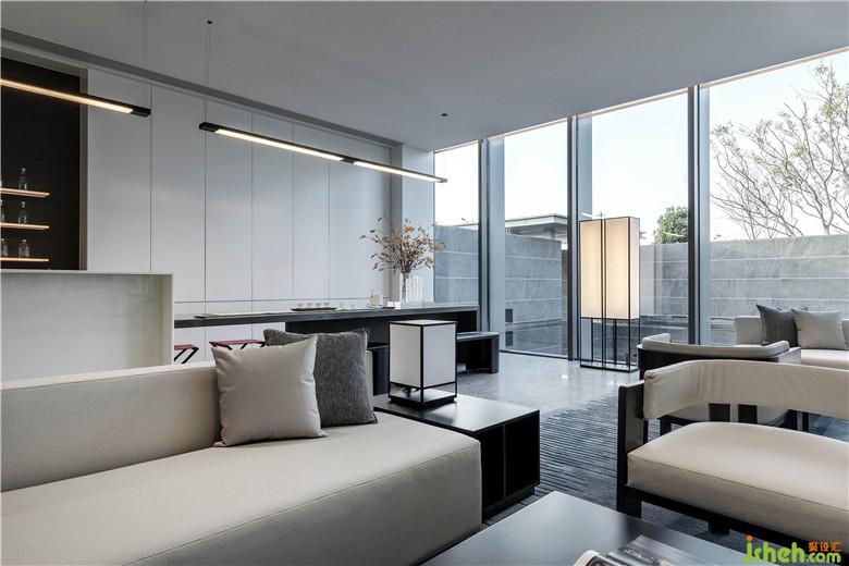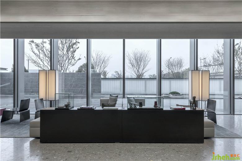 洽談區(qū)采用大面積落地玻璃,庭院之景,為空間增色,春夏秋冬,變?yōu)橐环噬嬜?,人立于室?nèi),與自然產(chǎn)生連接,心境也因此越過藩籬,感受純粹的安寧。