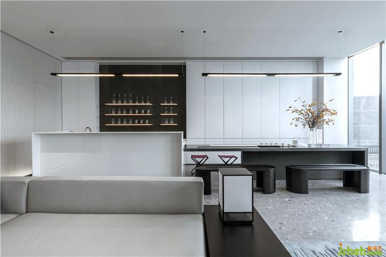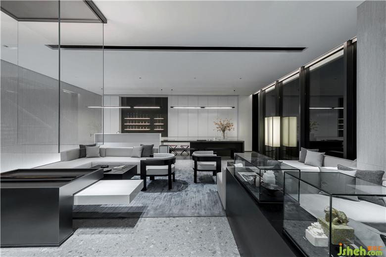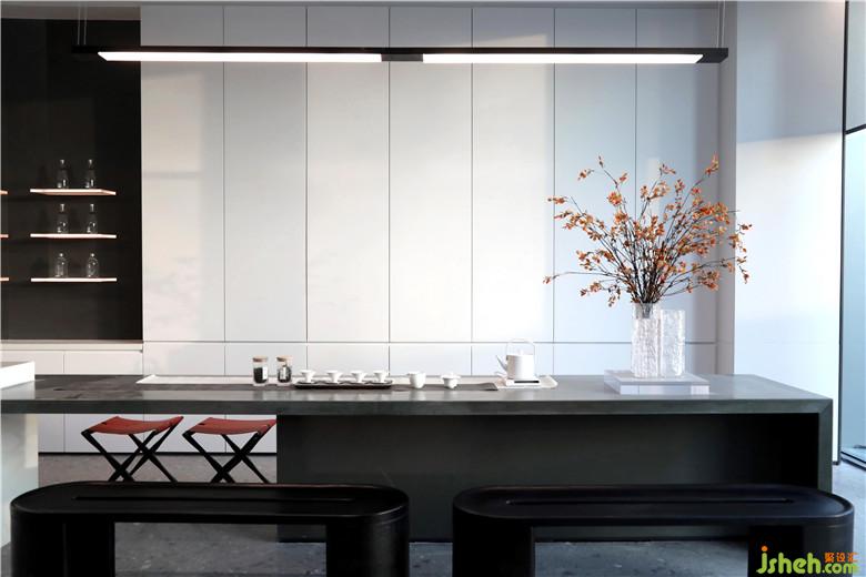 深藍單人座椅與長形灰白沙發(fā),柔和了空間的質(zhì)感,讓軟裝充滿素雅的基調(diào)。無論是洽談圓桌,或是黑色茶幾,皆賦予空間秩序般的美感。