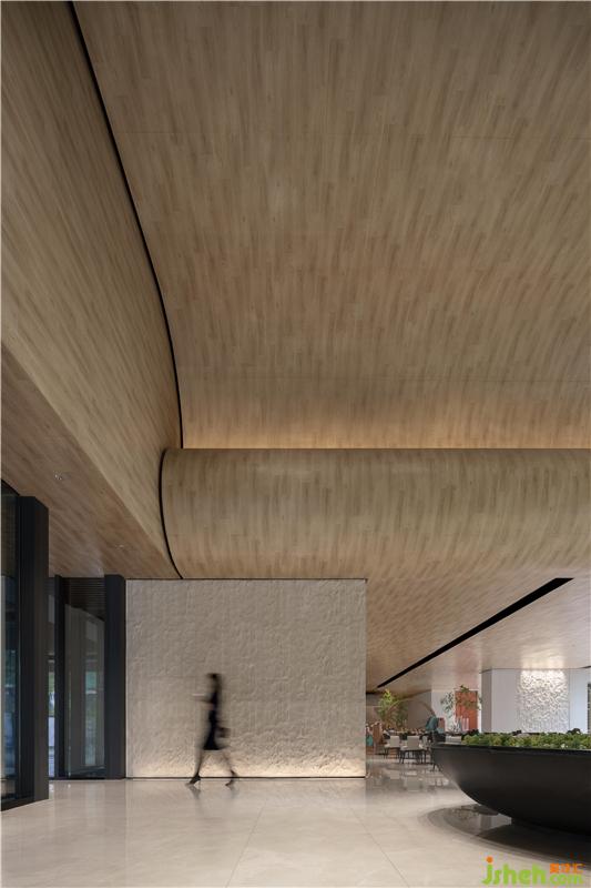 在室內(nèi)空間的構(gòu)建中,設(shè)計(jì)師從地域文化出發(fā),取嶺南特色建筑蝸耳墻之形感,采用現(xiàn)代設(shè)計(jì)手法,以當(dāng)代材質(zhì)為媒介,將其演繹于空間當(dāng)中。踏入接待前廳,便可從中一窺蝸耳屋古建筑之形。售樓處設(shè)計(jì)天花起伏有致,極具翻涌之勢(shì),呈現(xiàn)出如蝸耳般流暢的線條美感,從接待前廳延伸至沙盤(pán)區(qū),體現(xiàn)了空間對(duì)當(dāng)?shù)厝宋木竦奶綄?。接待前廳的石頭藝術(shù)裝置保持著粗糙的肌理,與簡(jiǎn)潔干凈的天花形成對(duì)比,讓空間更具趣味性,同時(shí)與洽談區(qū)相呼應(yīng)。