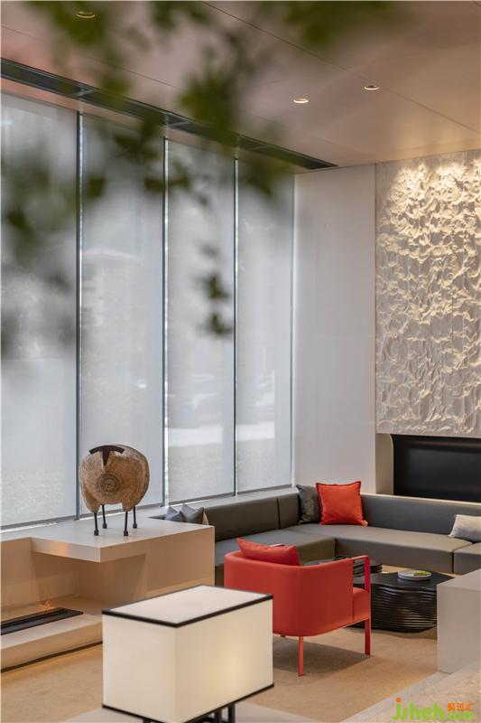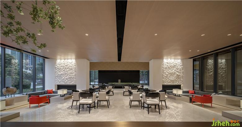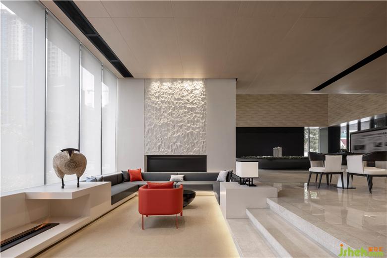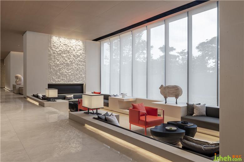 考慮到洽談區(qū)空間高度不高,設(shè)計(jì)師巧妙借用鳳城山水高低落差的巧思,將其體現(xiàn)在洽談區(qū)的空間構(gòu)造上。兩邊下沉式洽談區(qū)營(yíng)造圍合感,讓交談氛圍更輕松。同時(shí)高低落差的構(gòu)造結(jié)合落地玻璃窗,讓該區(qū)域更具空間層次,形成視覺上的趣味性。