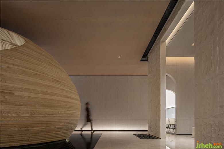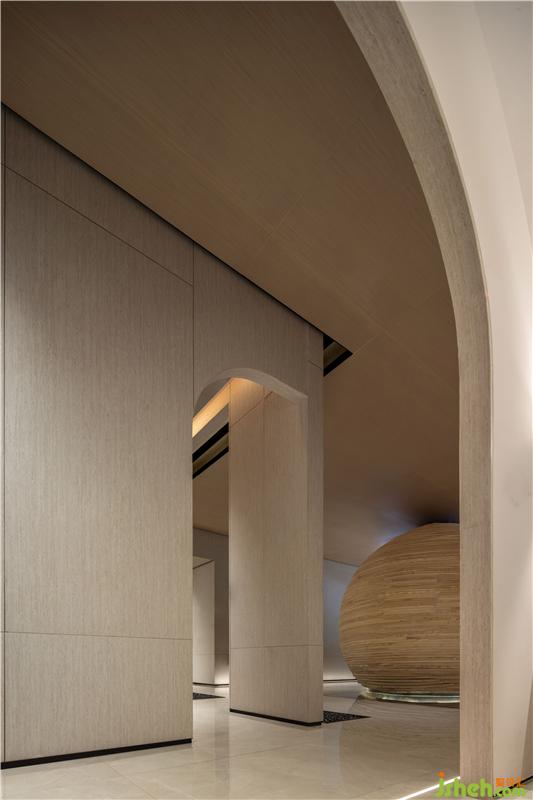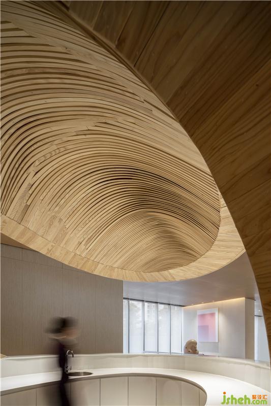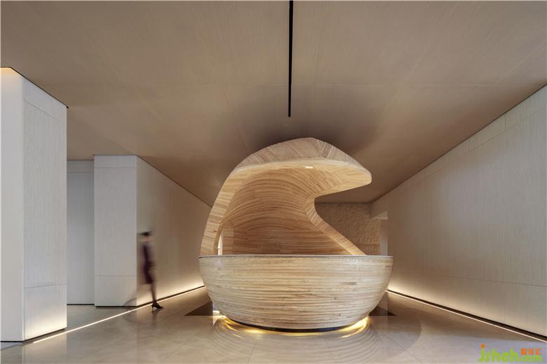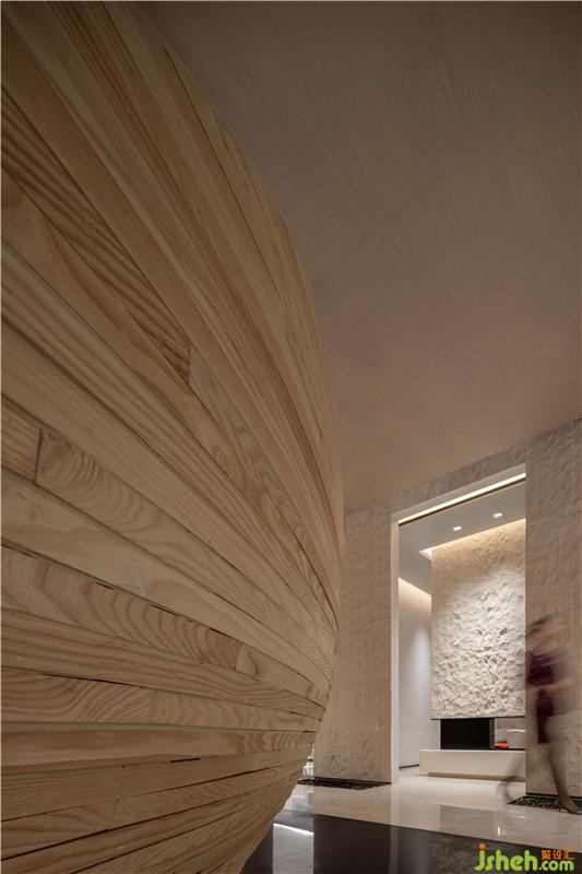 水吧區(qū)打破一般的構(gòu)造,售樓處設(shè)計將木質(zhì)材料結(jié)合鳳城奇山異石的形態(tài),將水吧臺變成空間中的藝術(shù)裝置,打造項(xiàng)目獨(dú)特的記憶符號。溫潤的材質(zhì)與極具張力的表現(xiàn)形式結(jié)合,塑造了空間的場景感,體驗(yàn)別樣的空間感受。