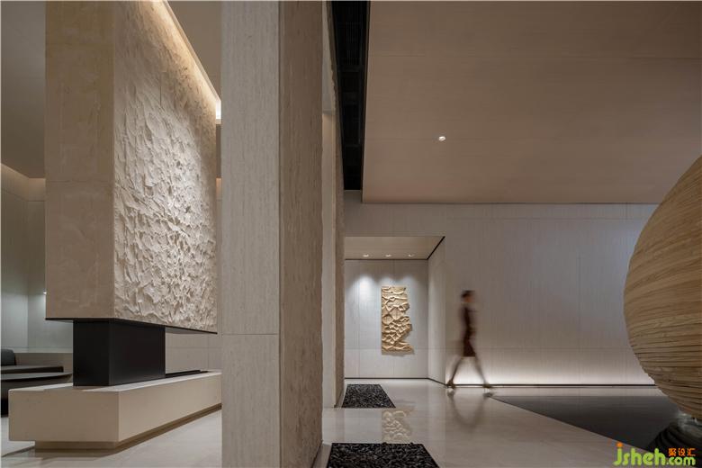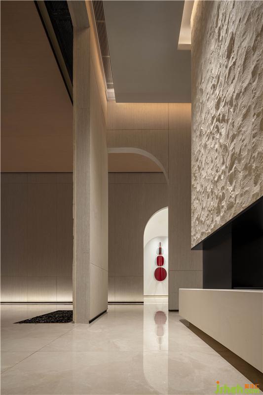 VIP洽談區(qū)延續(xù)山石粗糙的紋理,同時以簡潔的幾何體塊將空間進(jìn)行簡單的分割。明暗相間的光影效果,售樓處設(shè)計不同材質(zhì)之間的對比,形體的分割,讓空間演奏更生動的韻律,再多一些戲劇性。