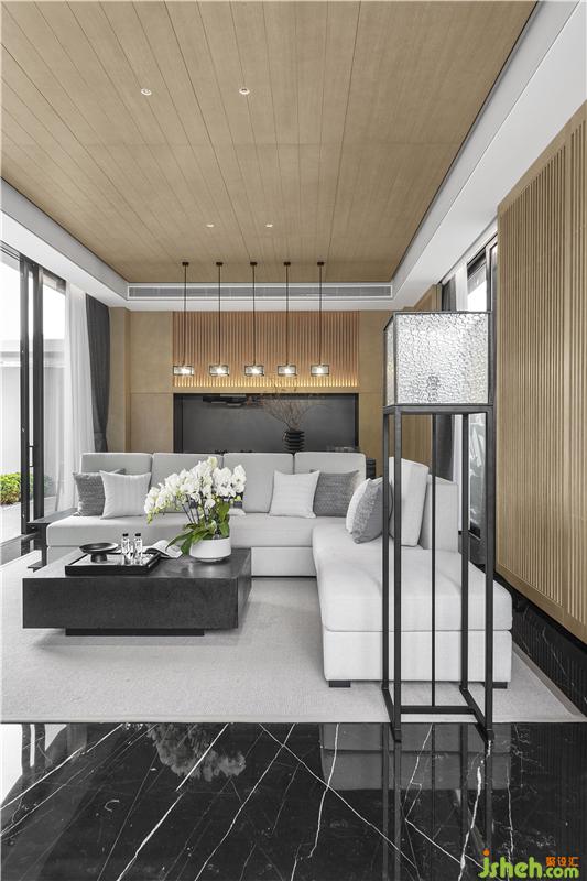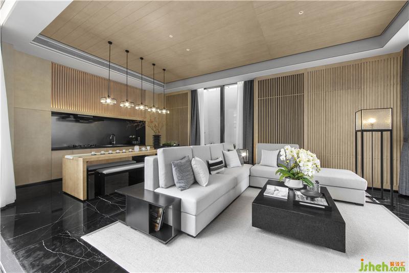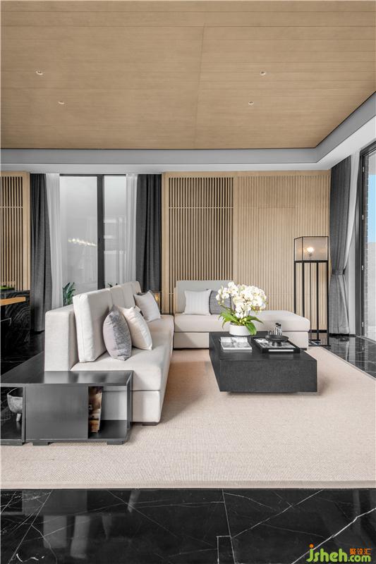 木質(zhì)的格柵給予客廳空間溫暖的包圍,質(zhì)樸的氣息由此流露而出。序列般的空間布局,半圍合沙發(fā)結(jié)合大理石地面,帶來舒適感與親近感,簡約的元素,賦予室內(nèi)以靜雅。