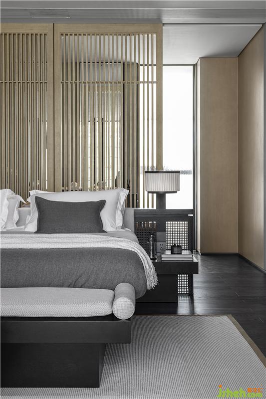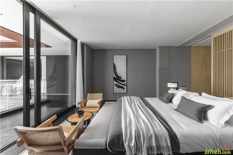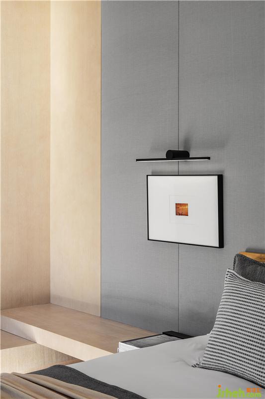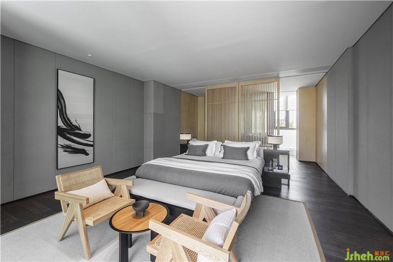轉入二層主臥,墻壁的水墨掛畫“言有盡而意無窮”,水墨與虛白相互襯托,描繪出簡潔與空靈的意境,與空間的主題相呼應。主臥延續(xù)了空間純粹的基調,去除繁雜的設計語言,注重光與空間的互動,打造一個開闊的場域,讓心越過藩籬