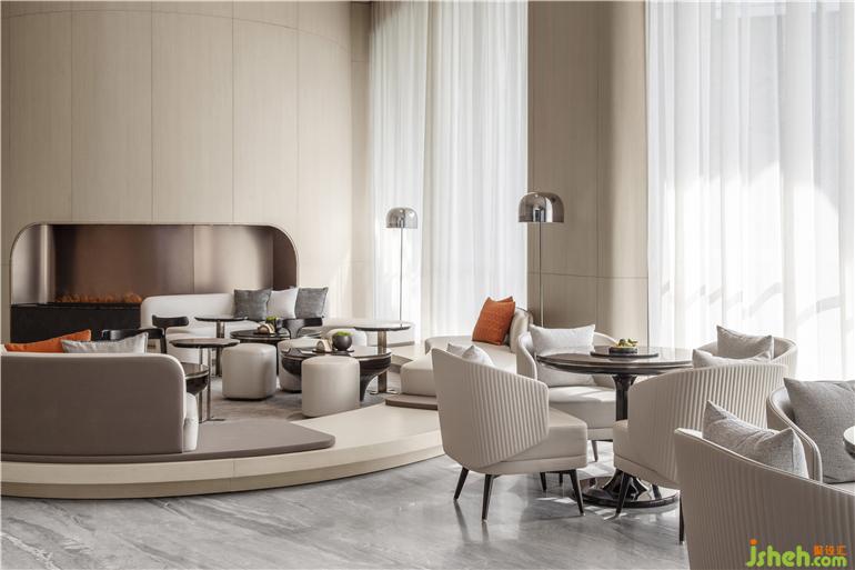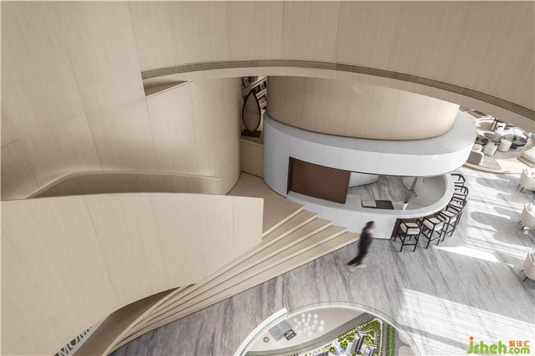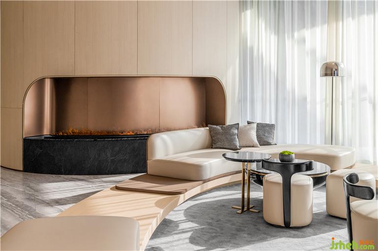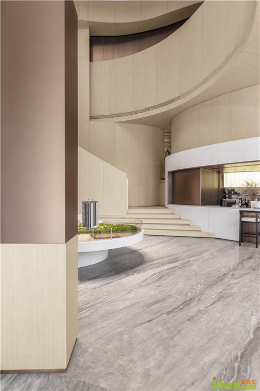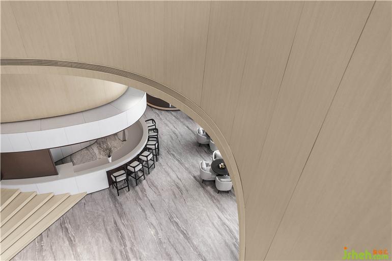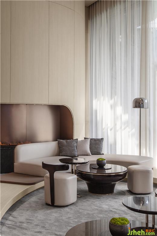 東莞卓越悅山湖花園銷售中心設(shè)計為了呈現(xiàn)空間的流動藝術(shù)感,洽談區(qū)在圓弧的建筑漫步背景下,給予溫暖的包裹。懸浮感的沙發(fā),與落地窗外的水景,地毯呼應(yīng),似流水沖刷到腳背,宛如身處漂浮的游艇之中。