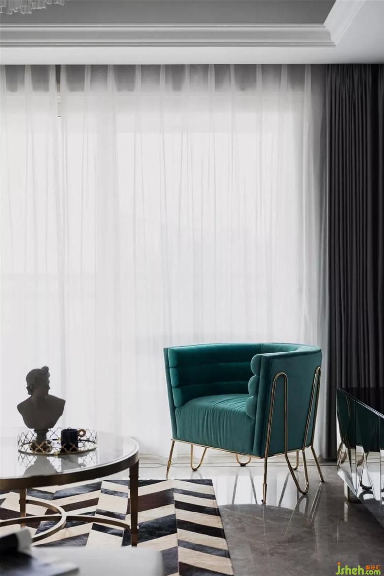 綠松石色的單人沙發(fā)在空間里起到了點(diǎn)睛的關(guān)鍵作用