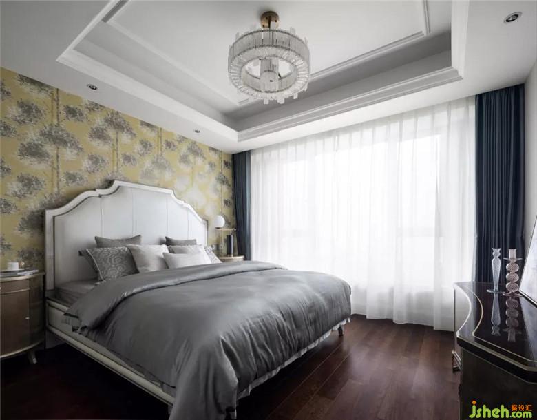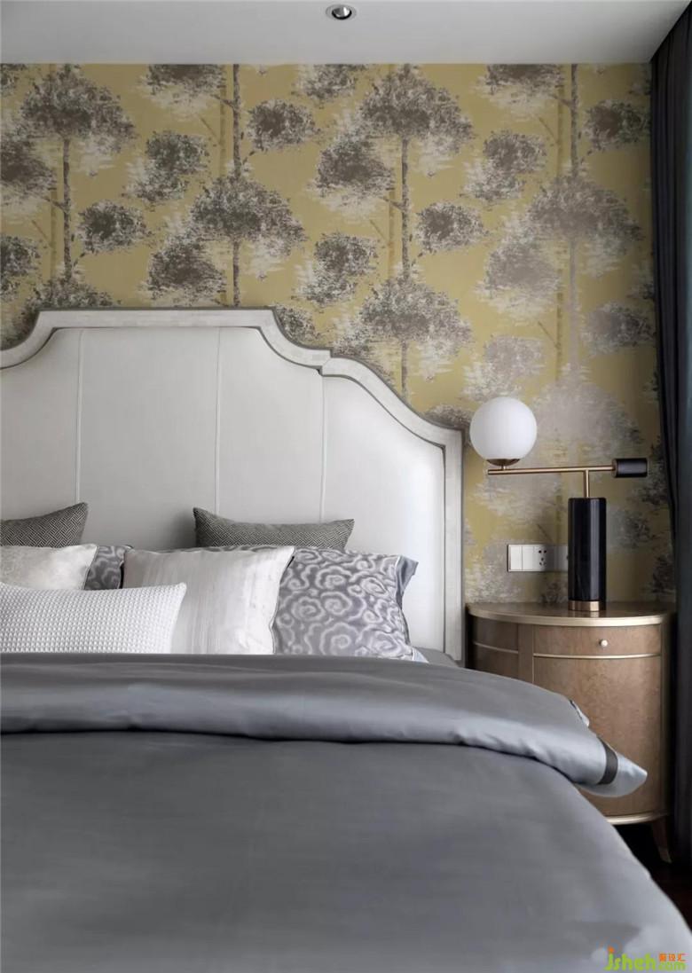 主臥床頭原是客廳相同的線條加燈帶造型,拆除吊頂后我們選用了一款抽象,黃色底色的墻紙配上邊框牛骨材質(zhì)床框,溫潤(rùn)優(yōu)雅。
