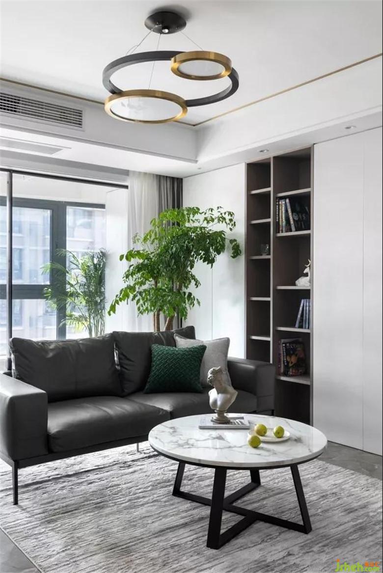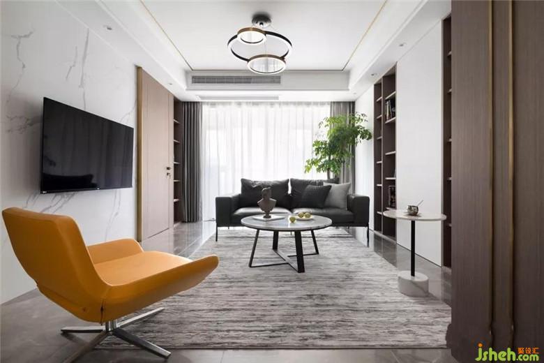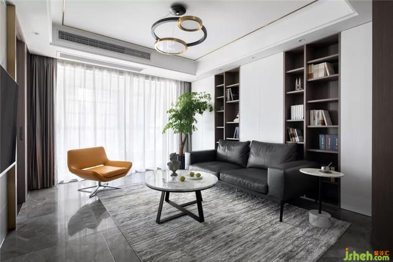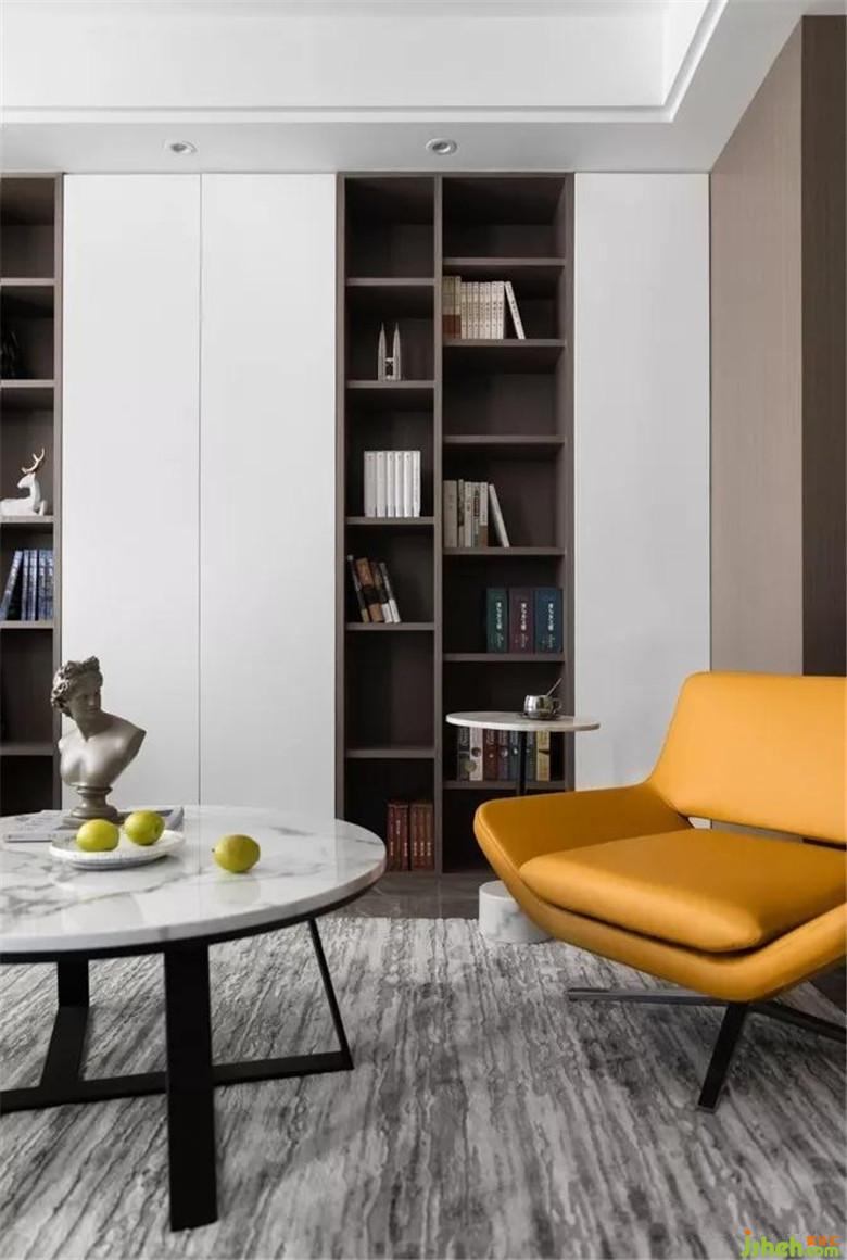本案客廳對(duì)坐式的格局滿足了屋主對(duì)于互動(dòng)交流以及閱讀收納的需求,同時(shí)考慮到收納及清理的便捷性,客廳正面柜體采用了柜體封閉與展示交錯(cuò)的設(shè)計(jì),豎向的線條拉伸了空間,使之顯得高挑
