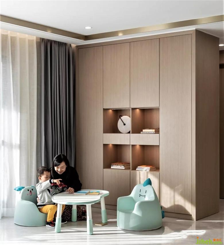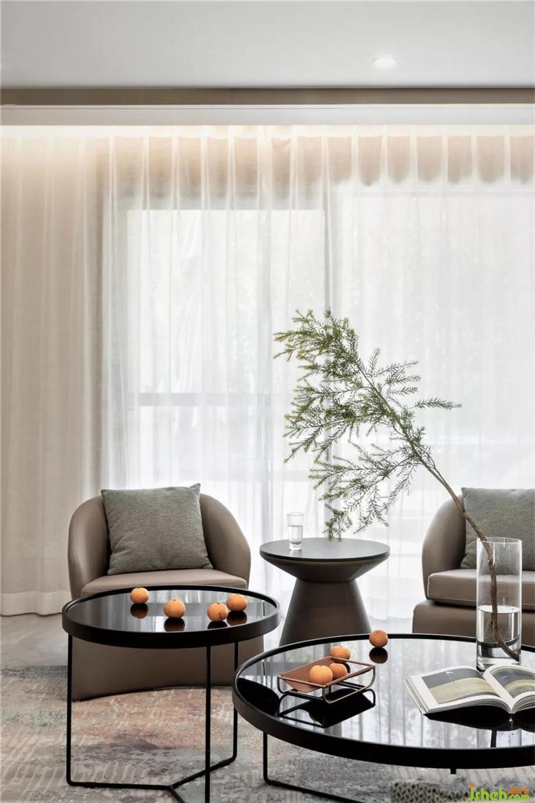 裝修公司對于會客廳的定位,一家人看看書或者一群人聊天,圍合式的沙發(fā)布局,提升互動性。一抹橙色,幾縷綠意,提升空間的柔和度和溫度。