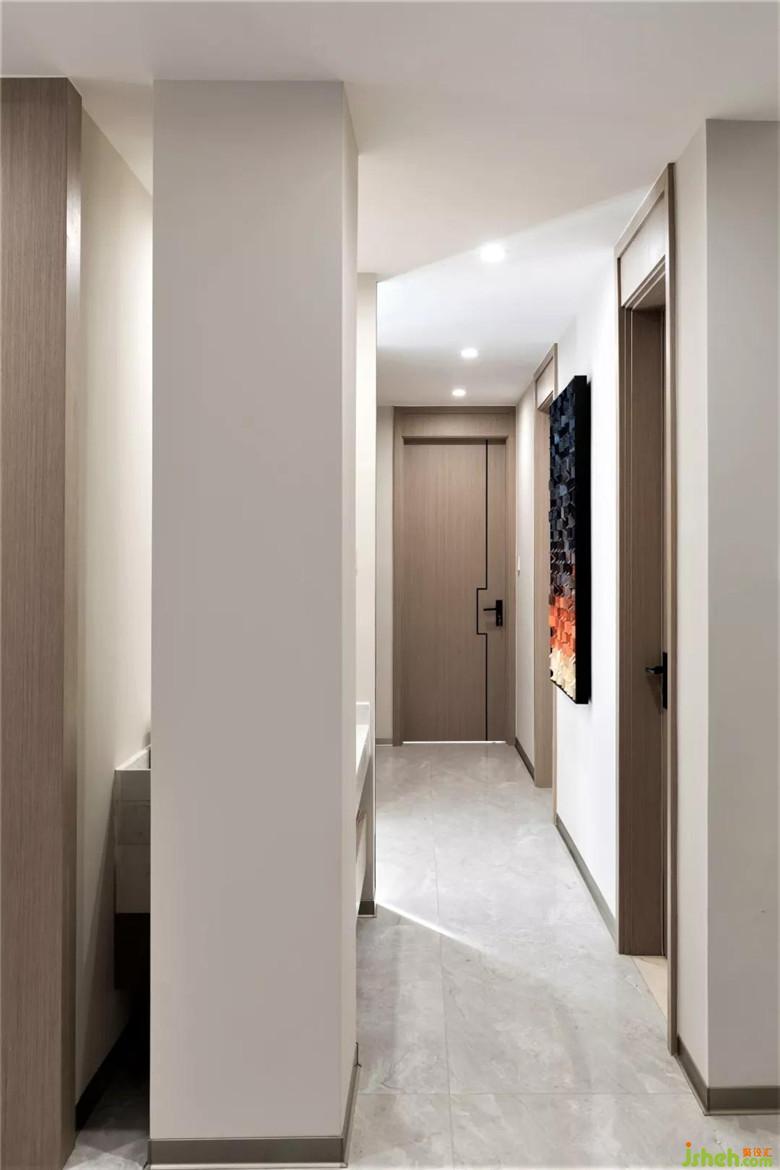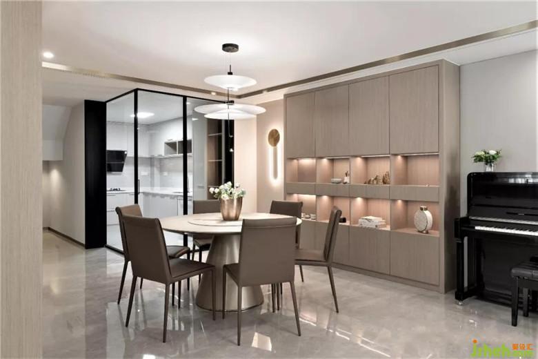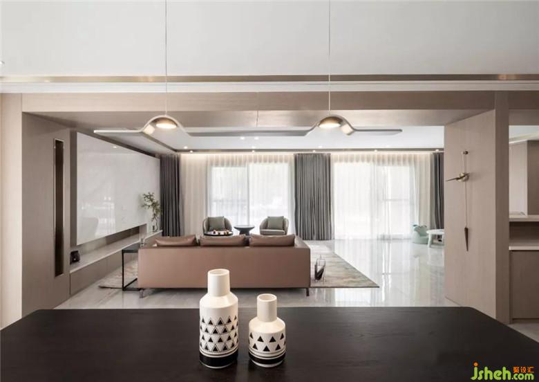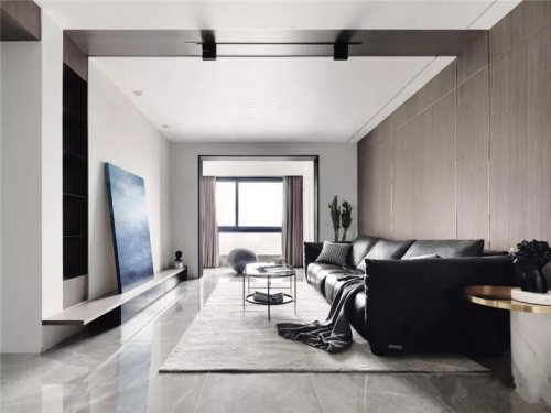 裝修公司選擇亮面大理石、啞光木飾面、中低飽和度的色彩搭配,讓客廳顯得靜謐。大理石與不銹鋼材質(zhì)結(jié)合的電視背景,顯得穩(wěn)重輕盈且
