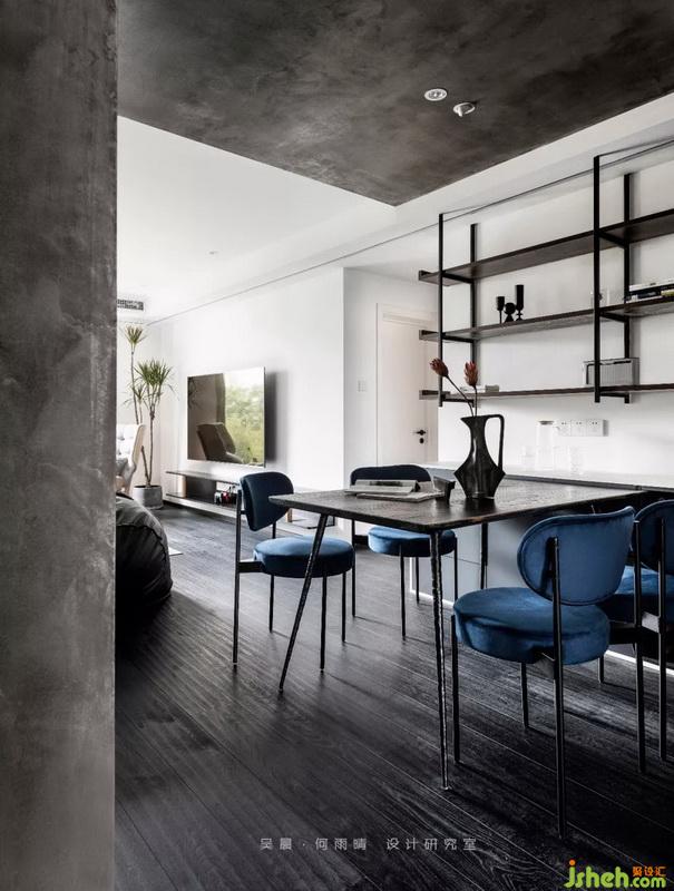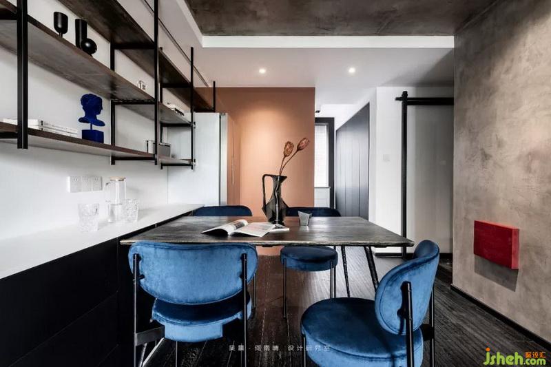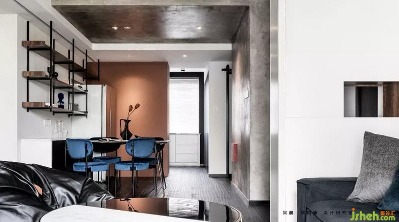 老房子層高的有限性、結構梁的界限,不如就讓空間像游戲般,從機能和感官上都有不同的趣味變化,墻頂看似包裹卻又無限延伸。木制、黑白材質(zhì)滿足收納機能,藏藍、明紅等猶如舞臺劇產(chǎn)生戲劇沖突感。