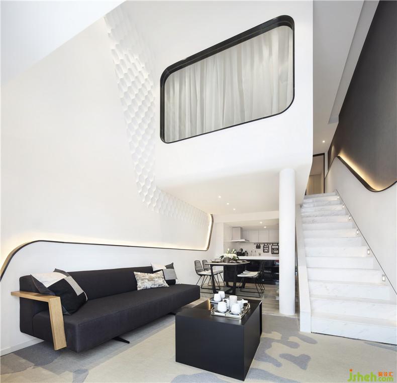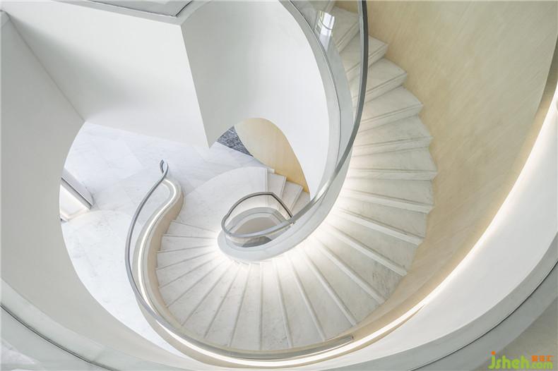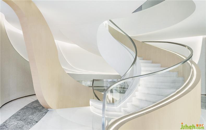 銷售中心的空間設(shè)計以無暇的白及簡潔的弧線為主導(dǎo),呼應(yīng)建筑結(jié)構(gòu)自身流動、向上的概念,大膽假設(shè)和定義人、建筑、空間及自然生態(tài)的新關(guān)系。隨著蜿蜒明亮的線條與螺旋形的樓梯,用者逐步過渡以至最后完全融入未來的空間。室內(nèi)設(shè)計師