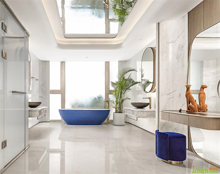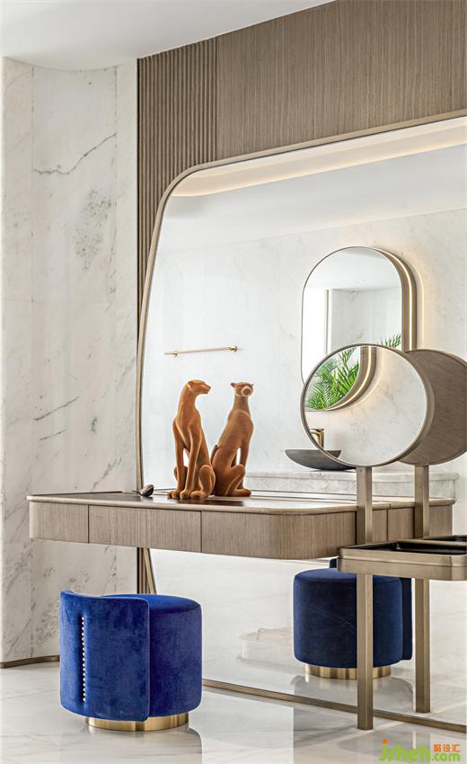 衛(wèi)生間石材紋理靈動(dòng)如水、色彩相互交錯(cuò),拼湊成油畫(huà)般的質(zhì)感,樣板間設(shè)計(jì)讓男女主人在輕奢中享受獨(dú)有的美妙與浪漫。