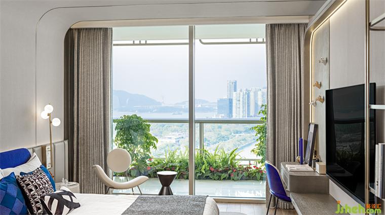 空間積蓄著希望和能量。幾何線條勾勒出窗外自然清新的畫面,直線與弧線之間的交流碰撞。樣板間設(shè)計貫穿空間的藍色,點綴的手法讓兒童房充滿活力。