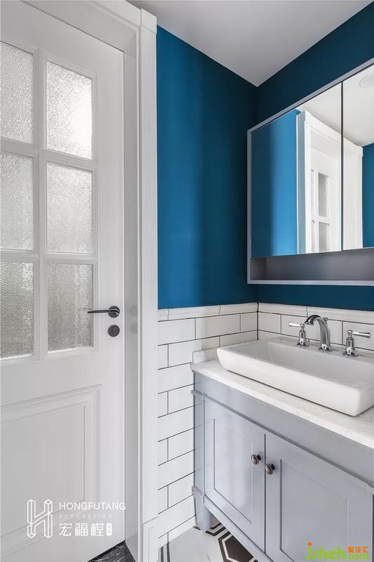 次衛(wèi)室內(nèi)設(shè)計(jì)師采用干濕分離,獨(dú)立使用,提高使用效率的同時(shí),保證了空間的舒適度;延續(xù)空間調(diào)性,選用磚式結(jié)構(gòu)搭配水藍(lán)色墻壁,上下結(jié)構(gòu)區(qū)分,層次感更強(qiáng);選用鏡后帶柜樣式的洗漱臺,增加了可收納空間。